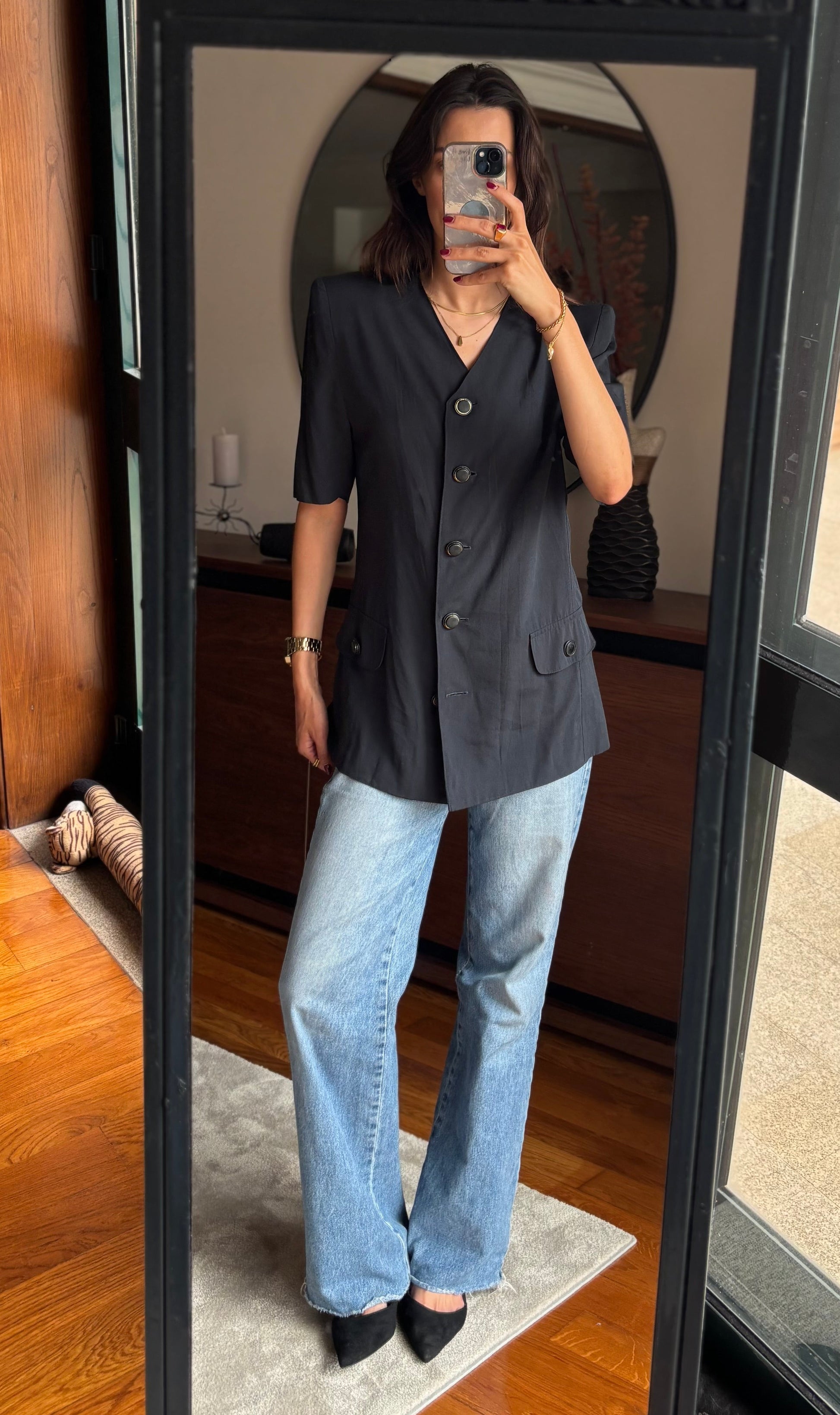 Camiss vintage preta elegante, com corte cintado, botões grandes frontais e feitio dos bolsos. Tem ombreiras que podem ser retiradas, conferindo-lhe estrutura e um corte super favorecedor. O tecido é leve, com toque acetinado discreto, ideal para um look sofisticado e intemporal. Pode ser usado como camisa ou blazer leve, perfeito para entremeios de estação.