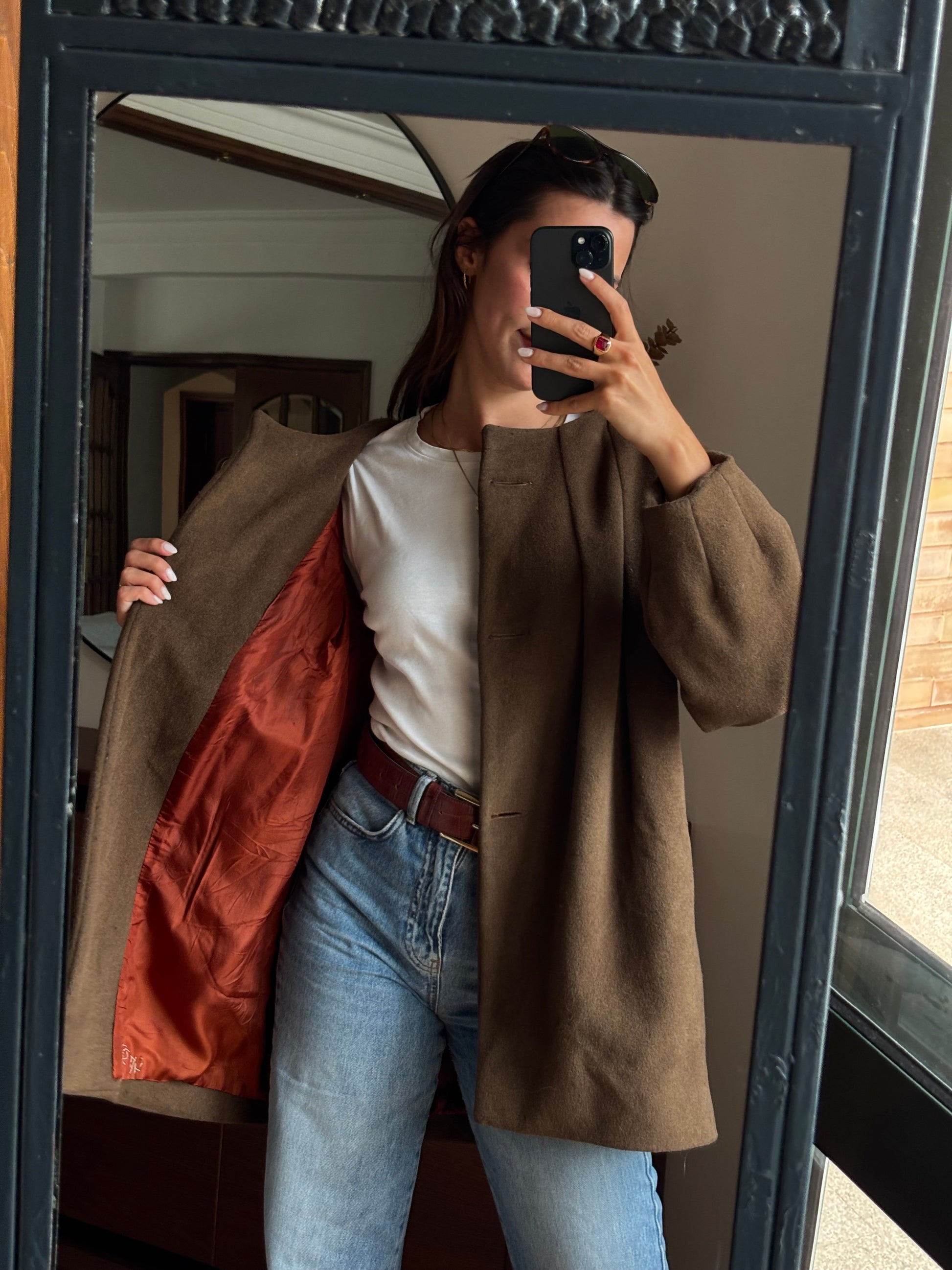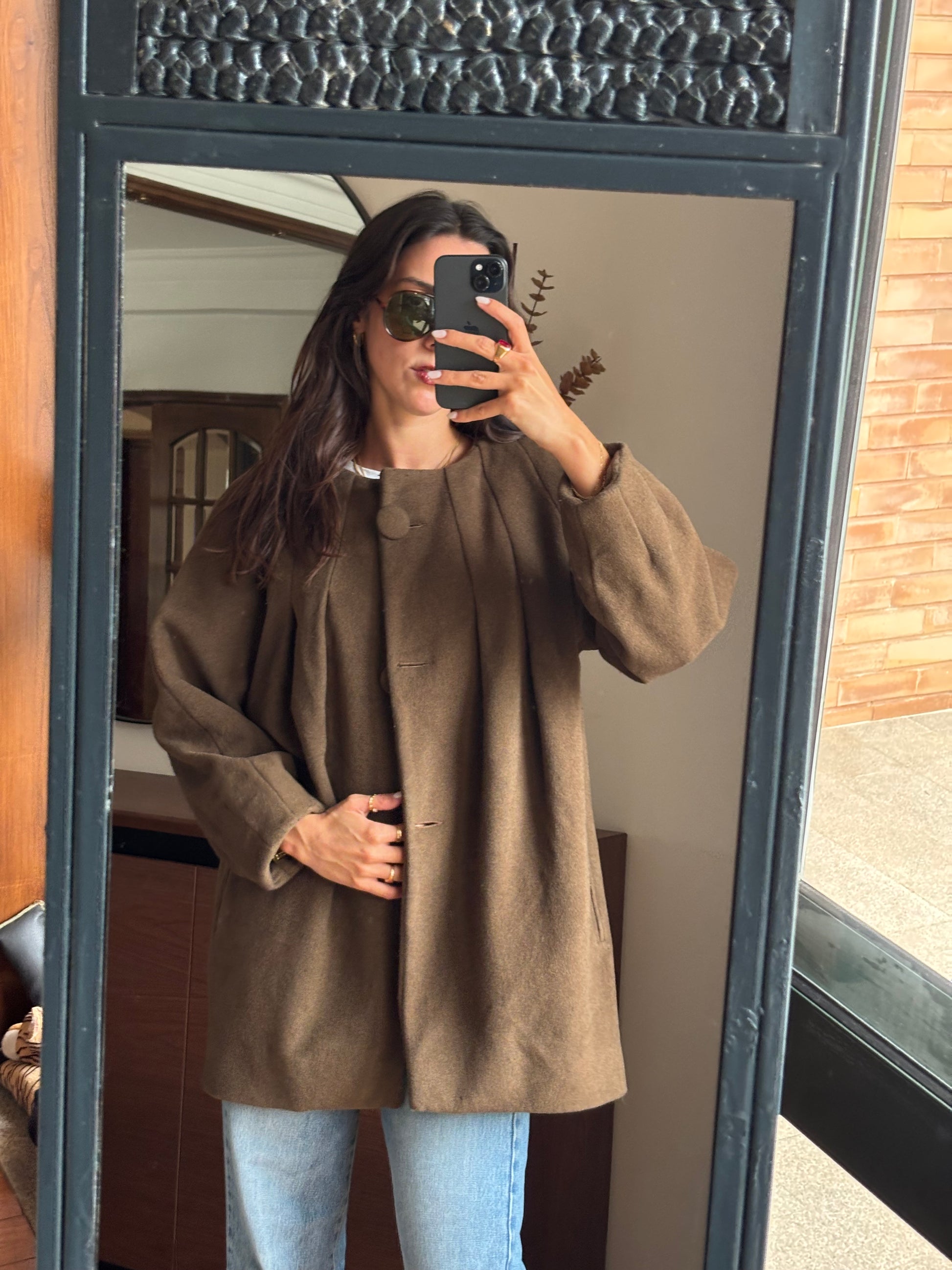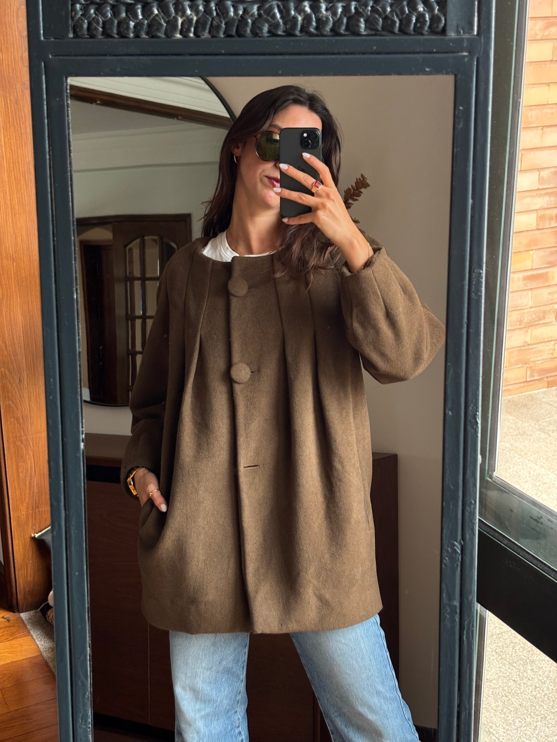 Casaco vintage de excelente qualidade, com um corte elegante e estruturado. Confeccionado numa mistura nobre de fibras naturais — lã, alpaca e angorá — que lhe conferem um toque macio, quente e muito confortável. O forro interior acetinado, num tom alaranjado rico, acrescenta um detalhe sofisticado e diferenciador