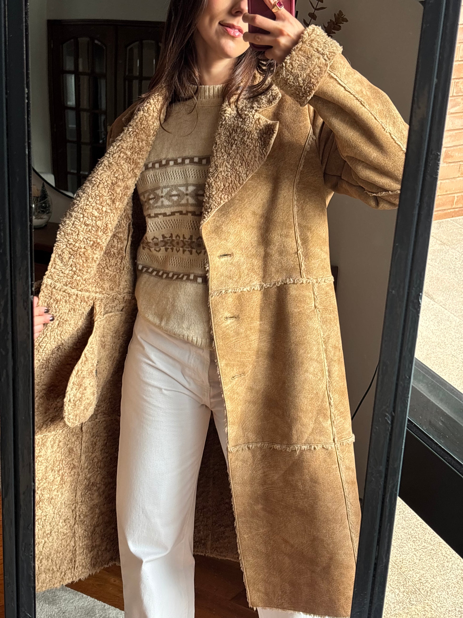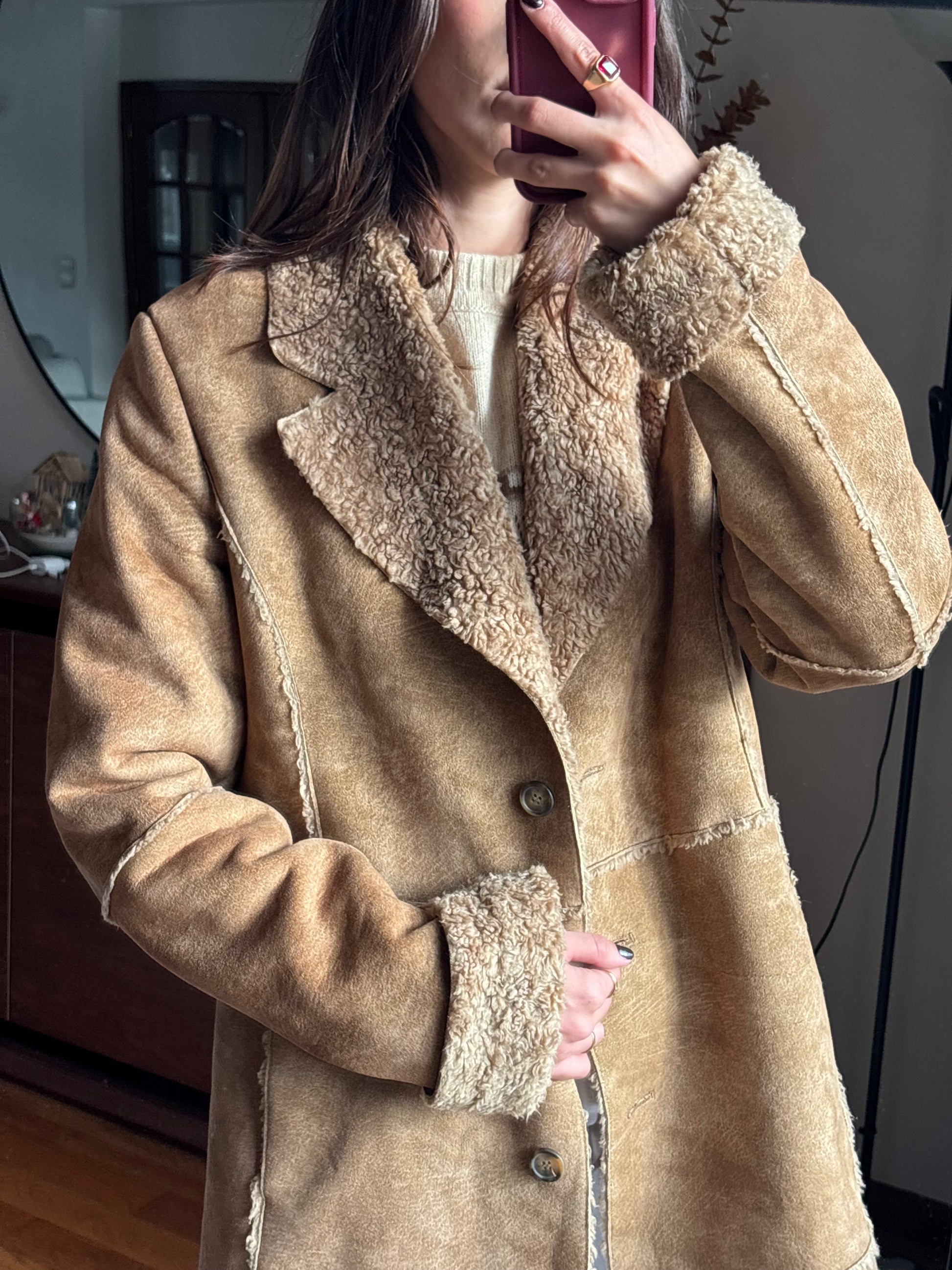 Casaco shearling em tom camel, com interior completamente forrado em pelo super macio e quente. Ainda mais lindo ao vivo. O corte é comprido e envolvente, com costuras visíveis que lhe dão um toque rústico e vintage muito bonito. As lapelas largas, os punhos forrados e a textura suave tornam-no numa peça especial para os dias frios.