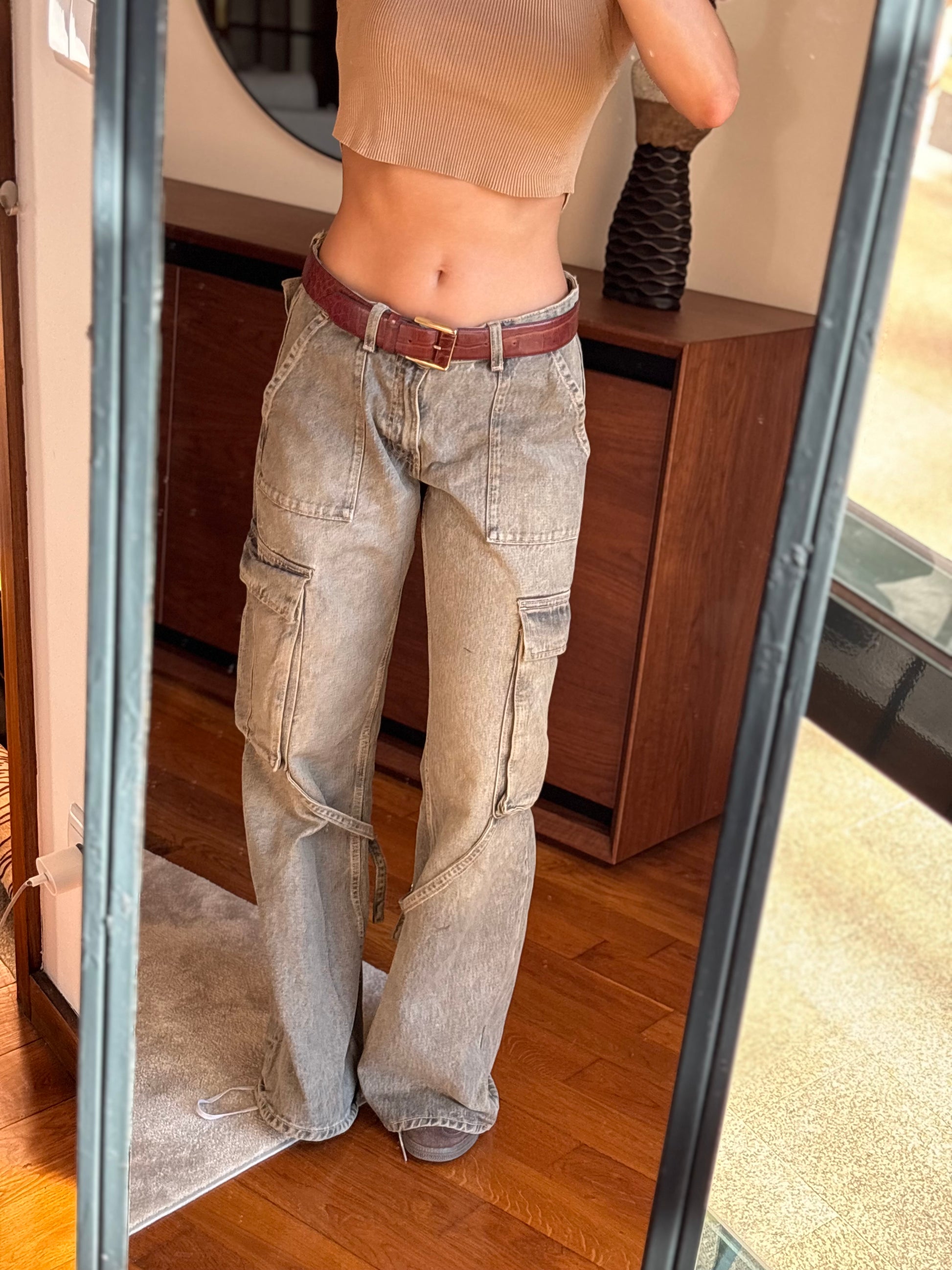 Calças cargo low waisted da Zara, num tom cinza lindo com costuras bege, de corte reto e perna larga. Têm cordões ajustáveis no fundo, bolsos frontais, traseiros e laterais, e presilhas para cinto. São super confortáveis, com tecido resistente e ótima qualidade.