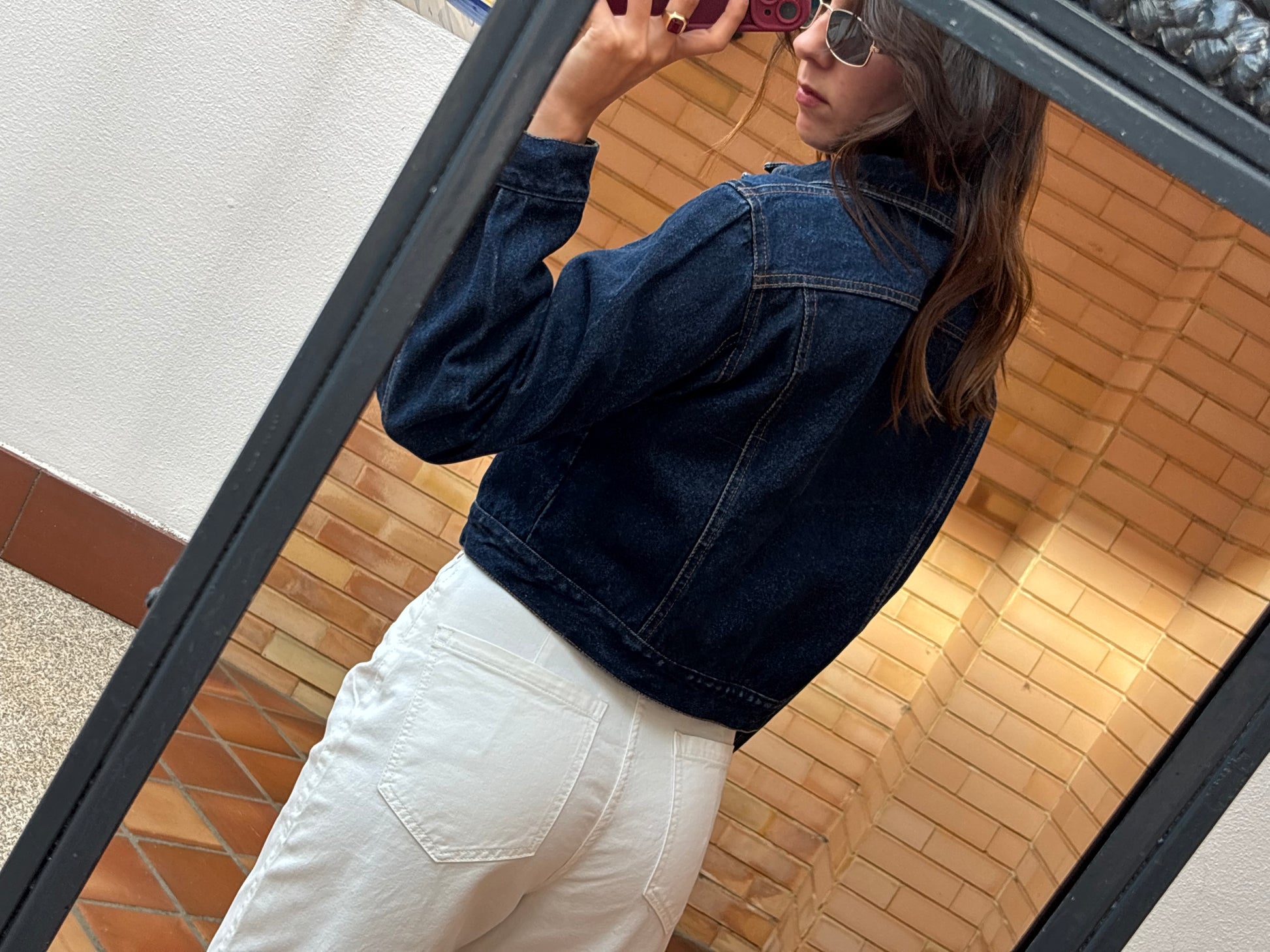 Casaco de ganga cropped, 100% algodão, com corte estruturado e acabamentos impecáveis. Tem aquele tom clássico de ganga escura que combina com tudo, e um caimento perfeito que valoriza qualquer look. Está absolutamente novo e é daquelas peças que ficam bem em qualquer estação — moderno, versátil e cheio de pinta.