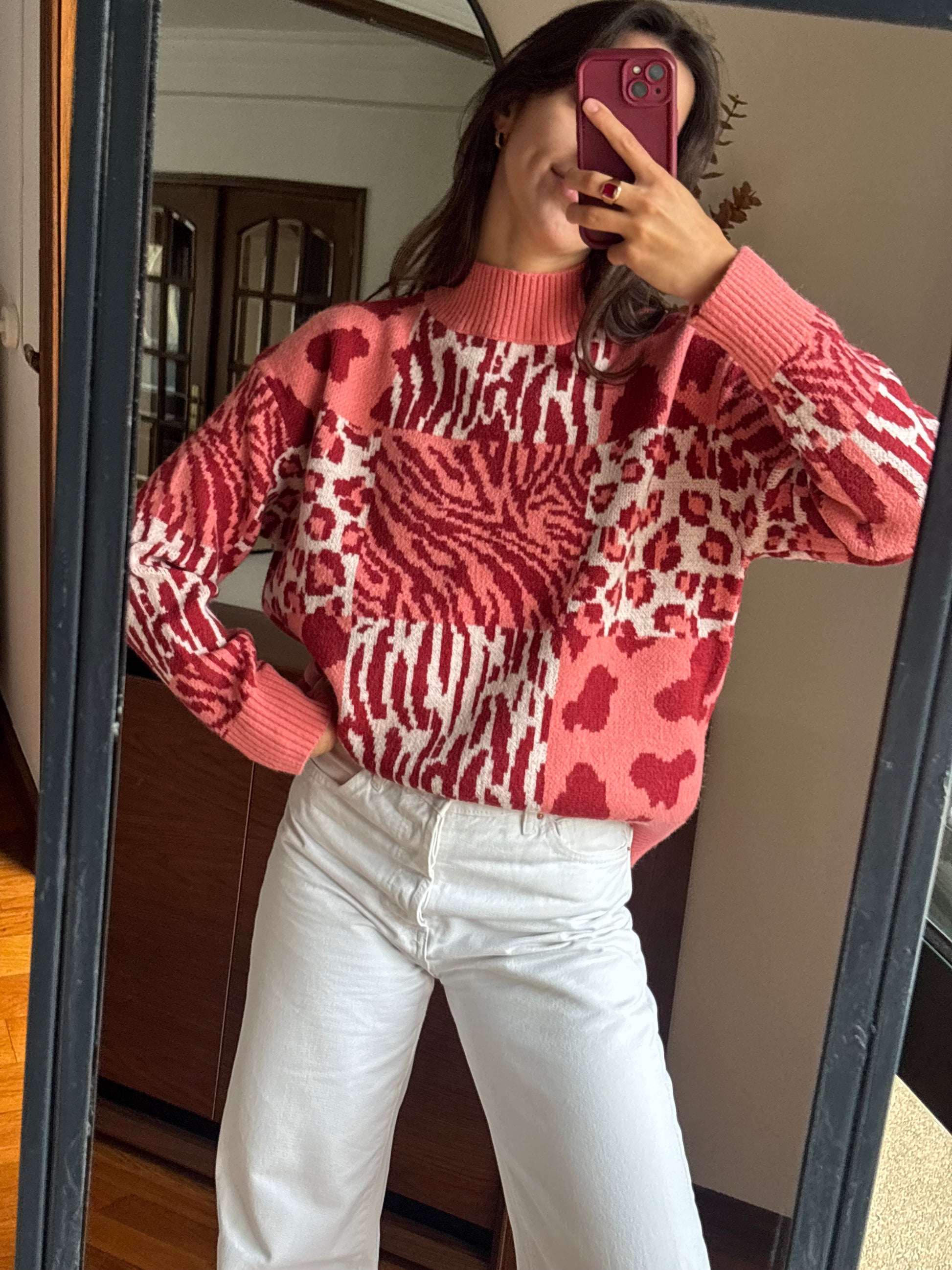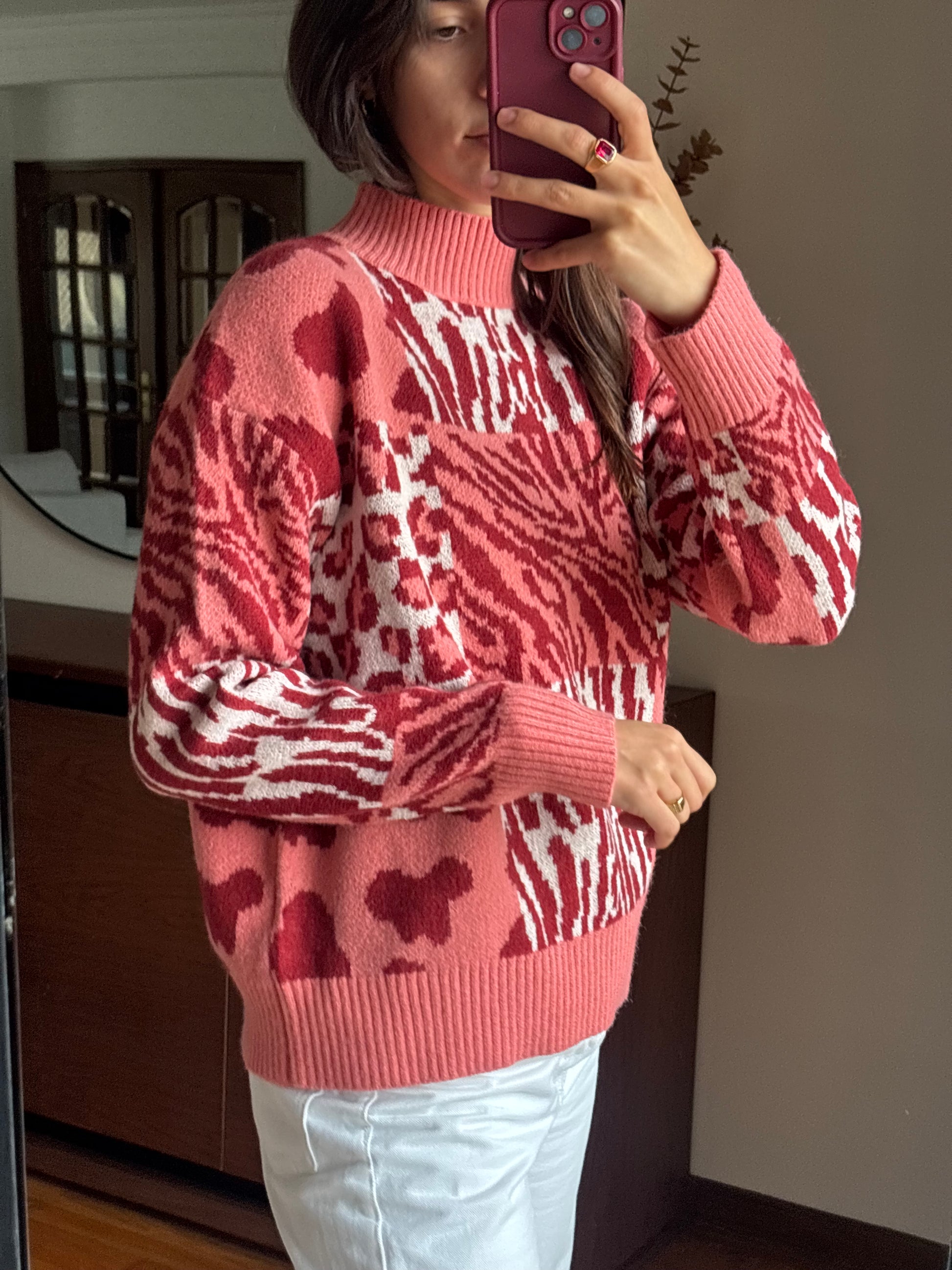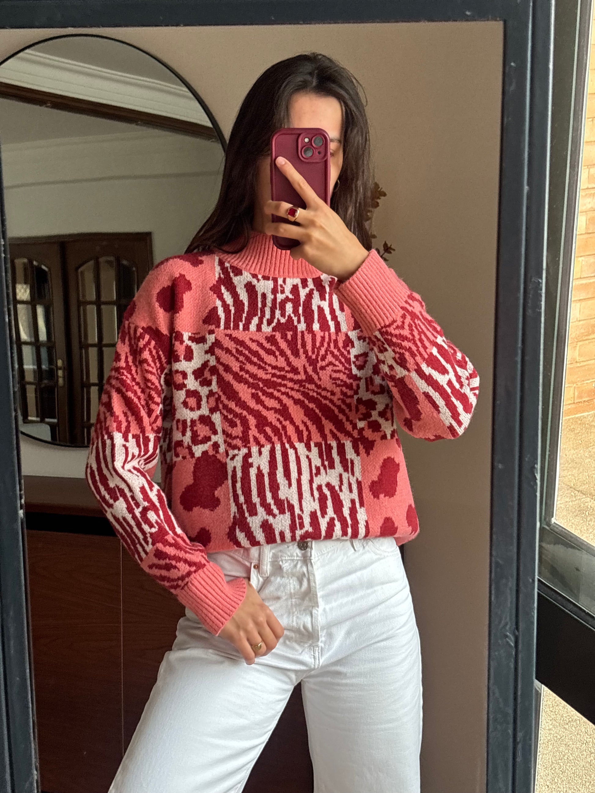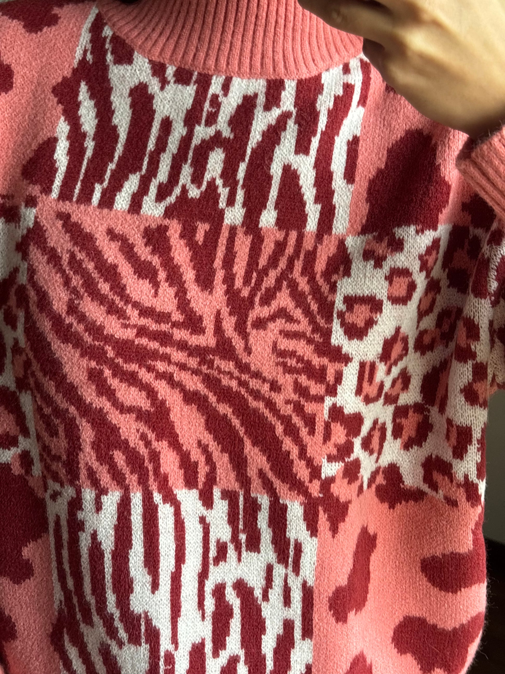 Malha perfeita com um padrão animal print em mistura de tons que lhe dá um ar moderno e cozy. Tem uma malha super macia, com bom toque e estrutura, e um corte ligeiramente oversized que fica lindo. É aquela peça statement que transforma um look básico num look cool sem esforço.