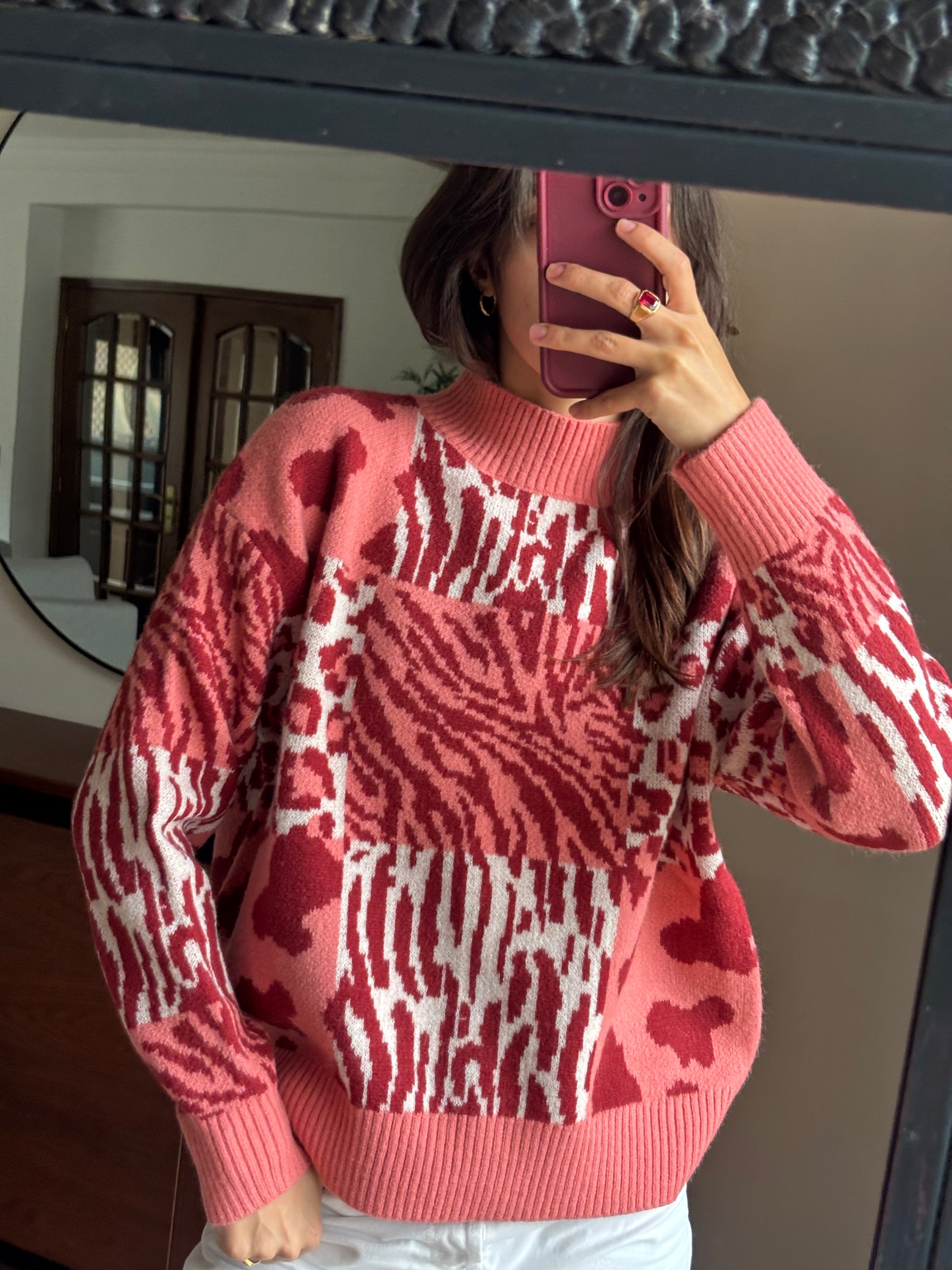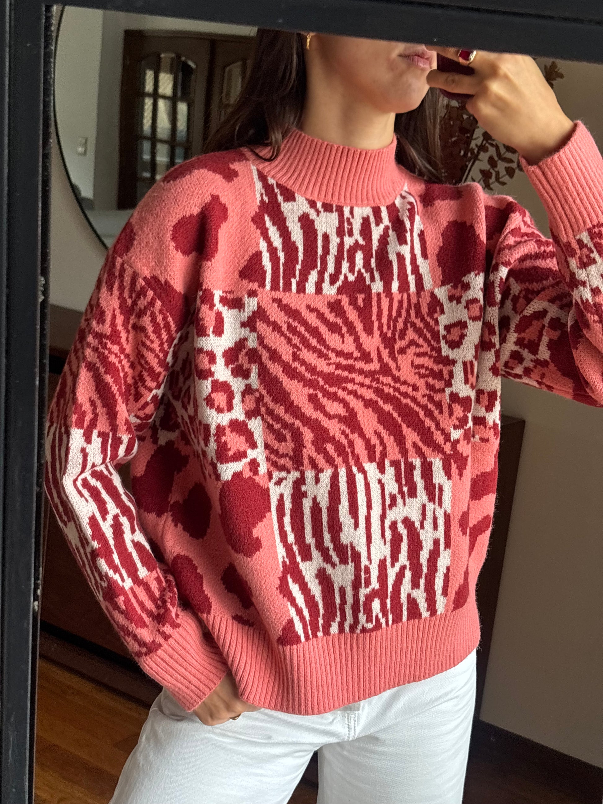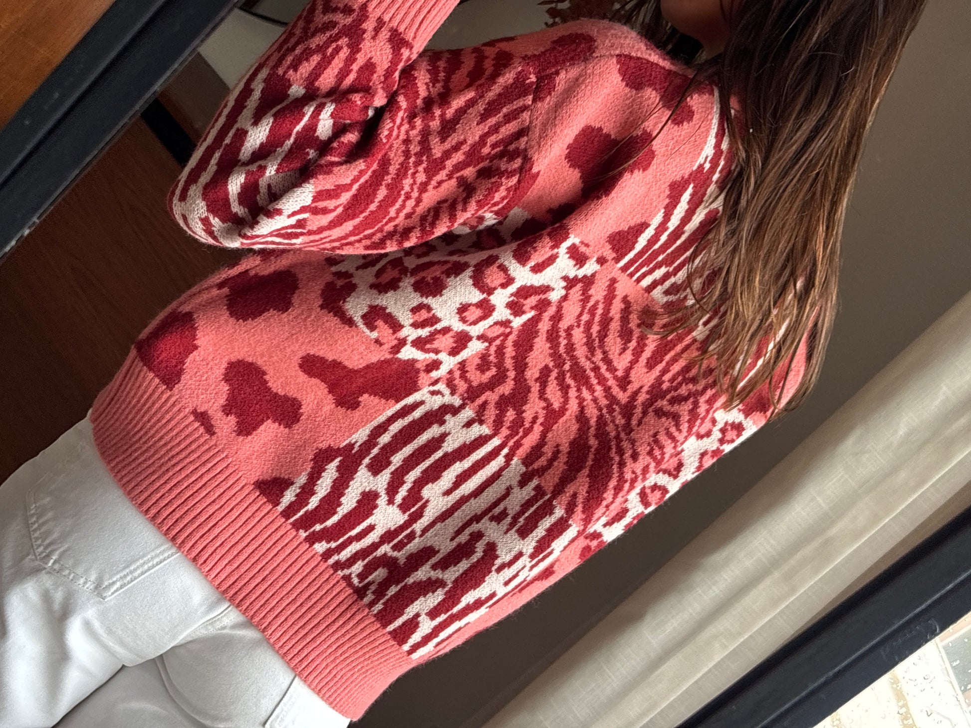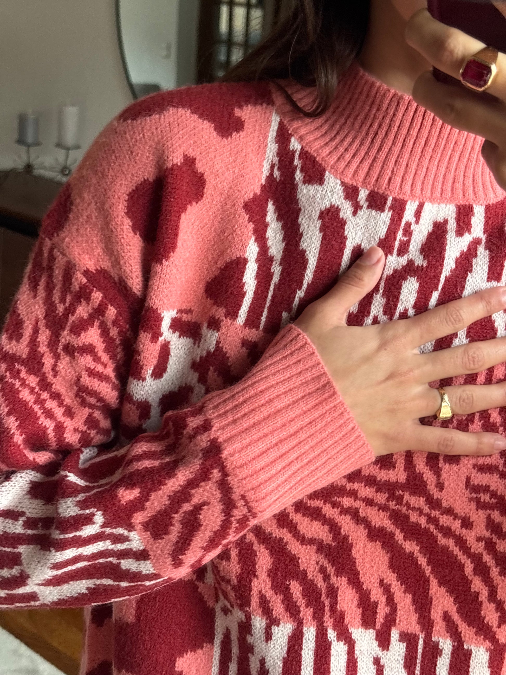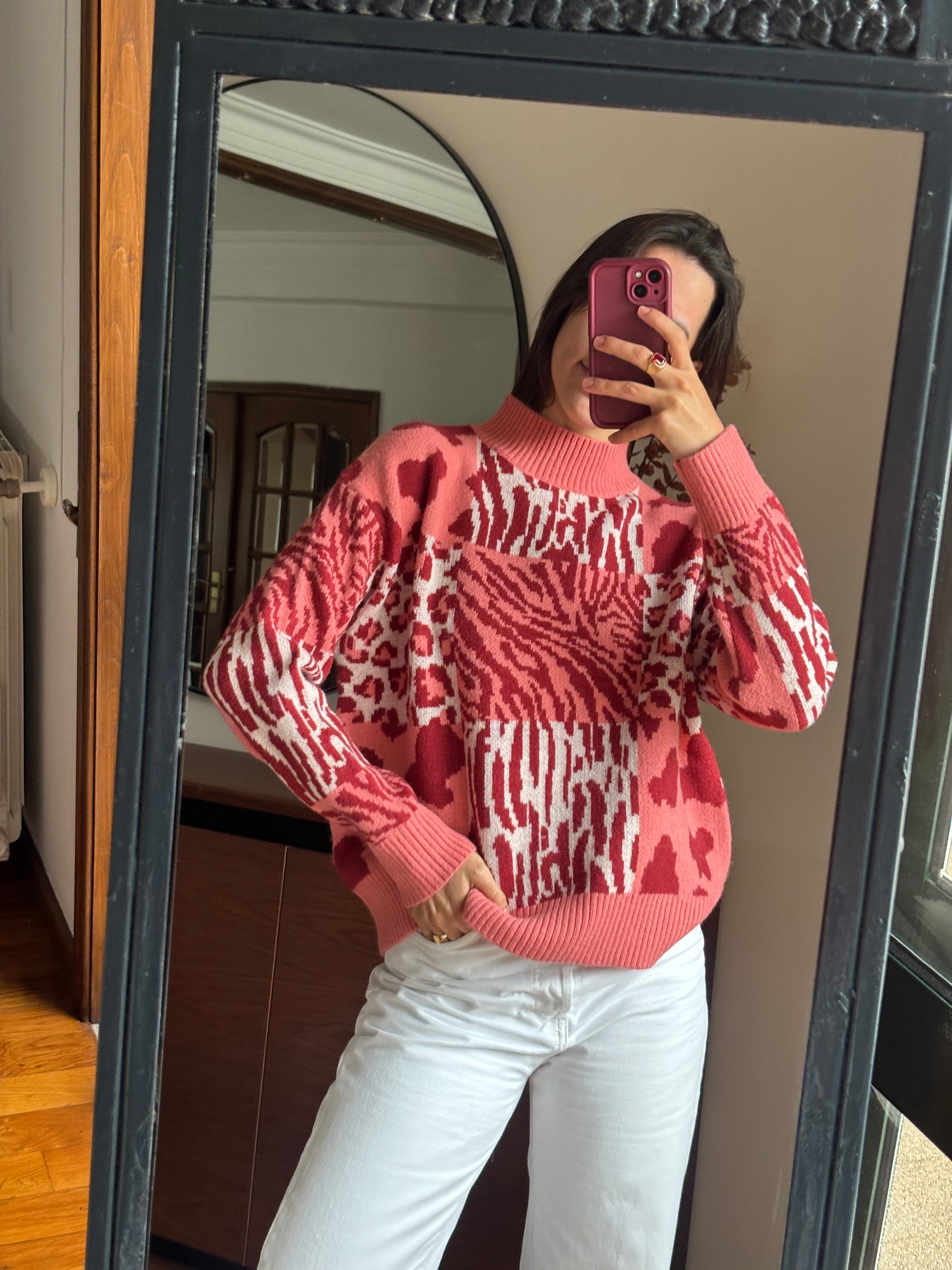Malha perfeita com um padrão animal print em mistura de tons que lhe dá um ar moderno e cozy. Tem uma malha super macia, com bom toque e estrutura, e um corte ligeiramente oversized que fica lindo. É aquela peça statement que transforma um look básico num look cool sem esforço.