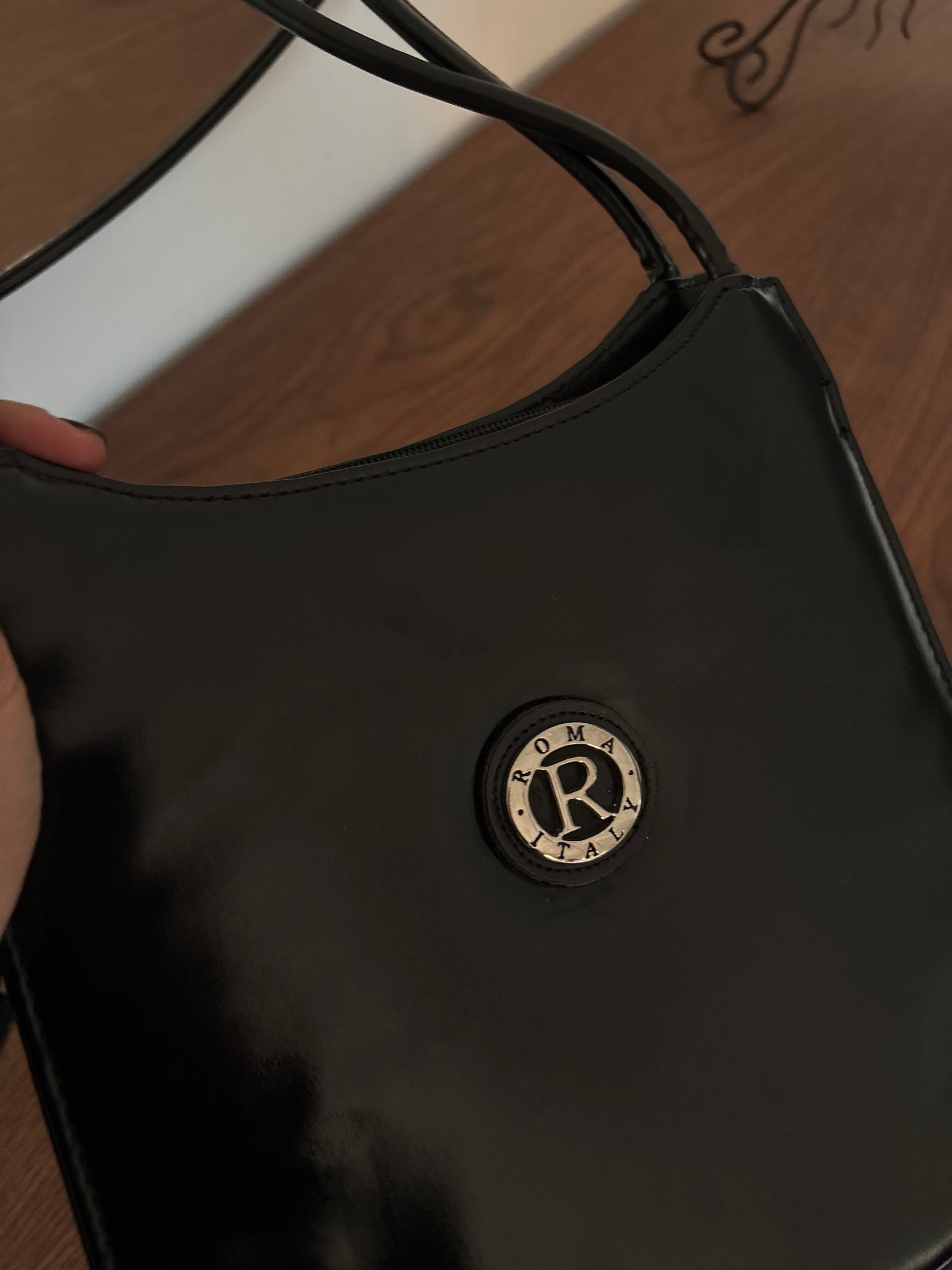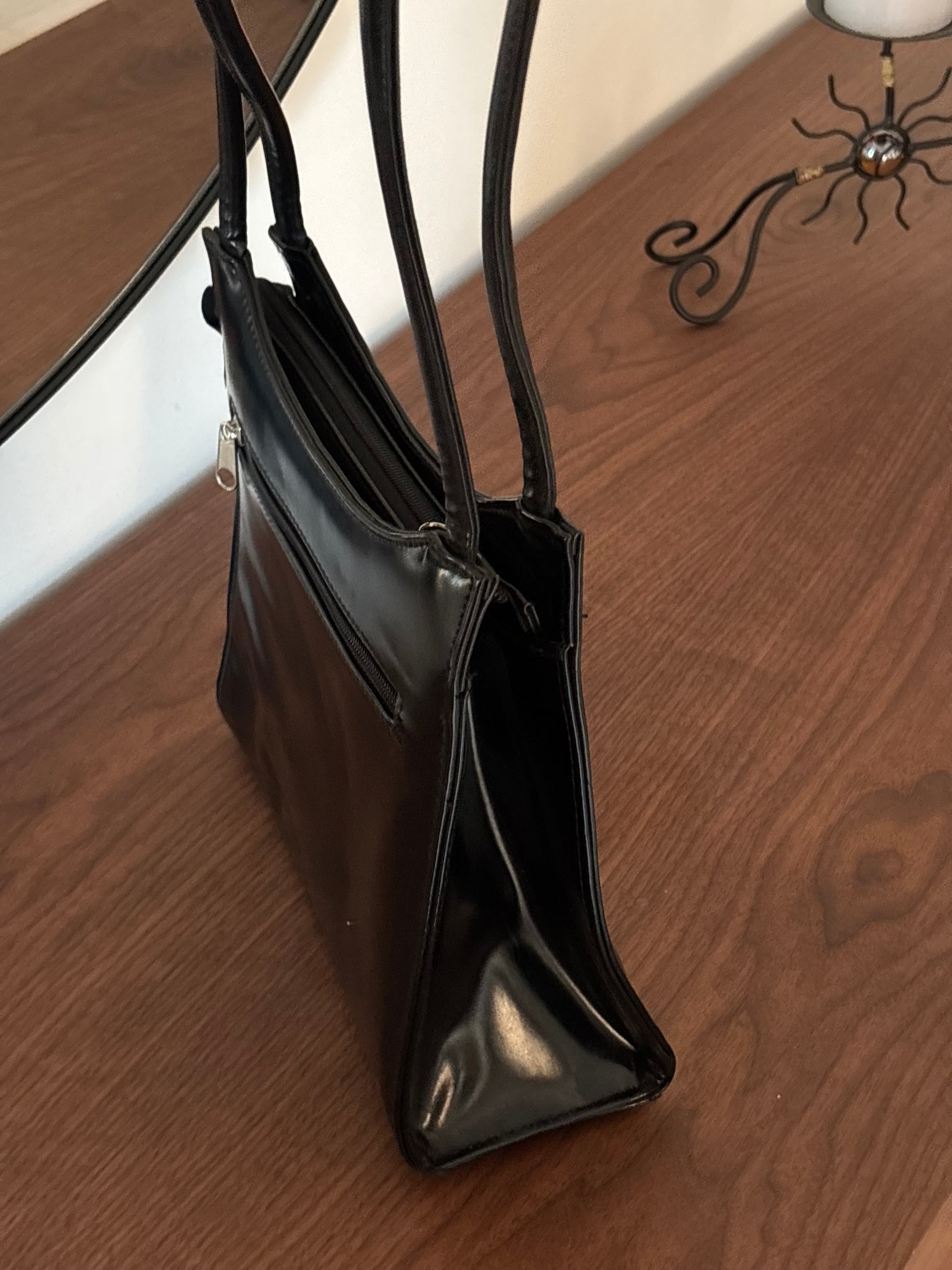 Mala vintage em preto, de linhas simples e intemporais, com um acabamento envernizado elegante que eleva qualquer look. Um modelo clássico e muito versátil, perfeito tanto para o dia a dia como para ocasiões mais arranjadas.