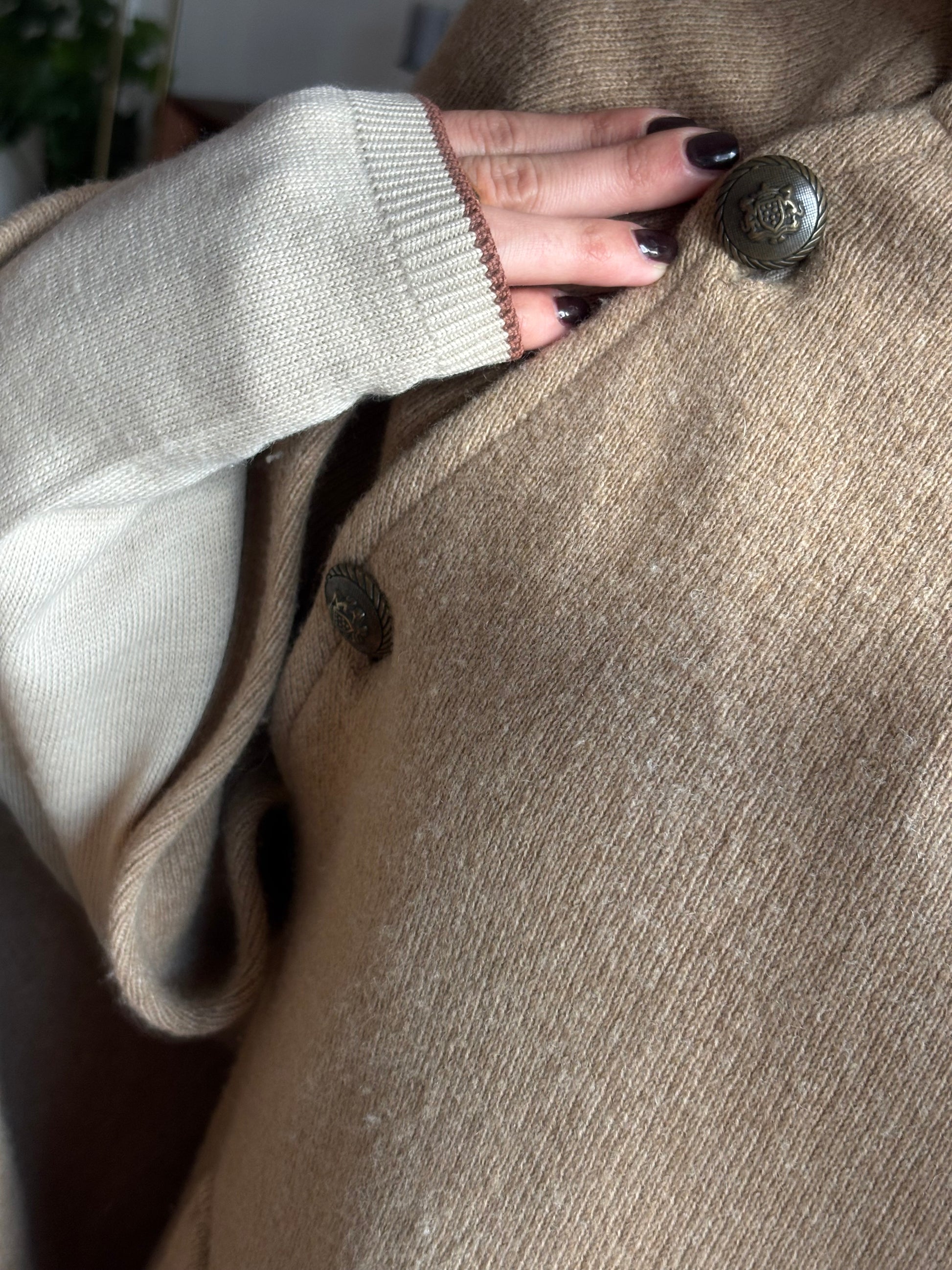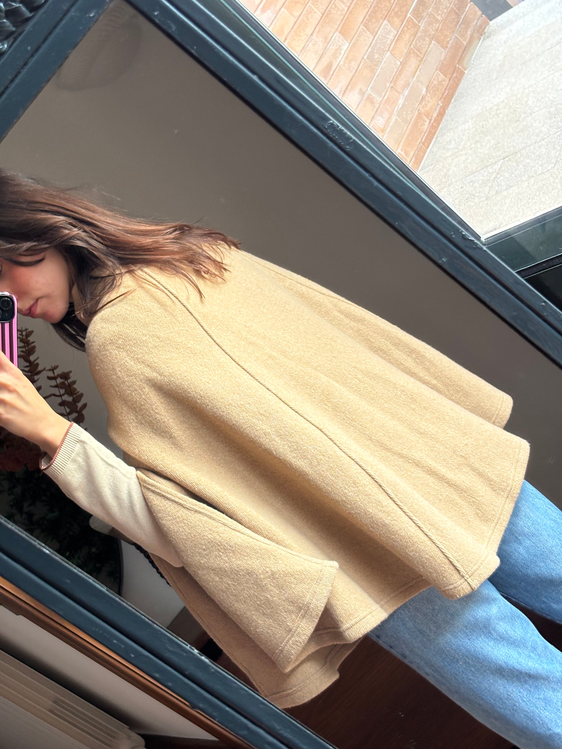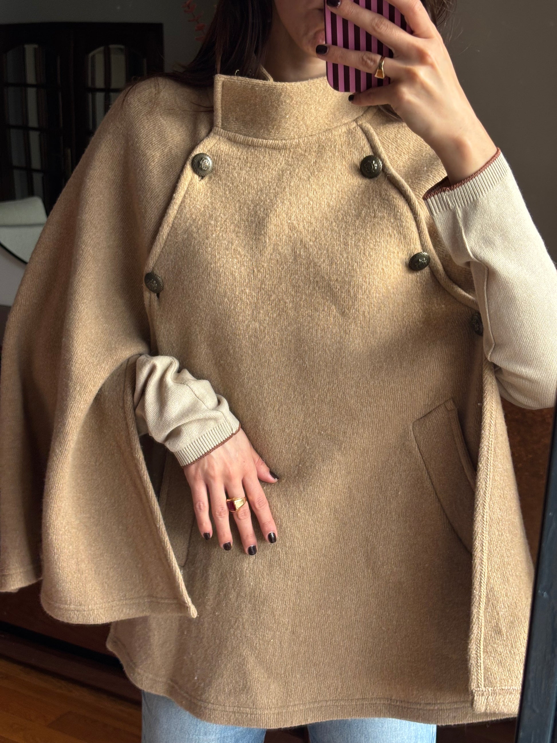 Capa de inspiração clássica, com um corte amplo e elegante que cai lindamente no corpo. A silhueta tipo capa, combinada com os botões metálicos de inspiração vintage e o detalhe do colarinho estruturado, torna esta peça especial e intemporal. É uma peça confortável, com bom peso, ideal para sobreposições e para dar aquele ar arranjado sem esforço.