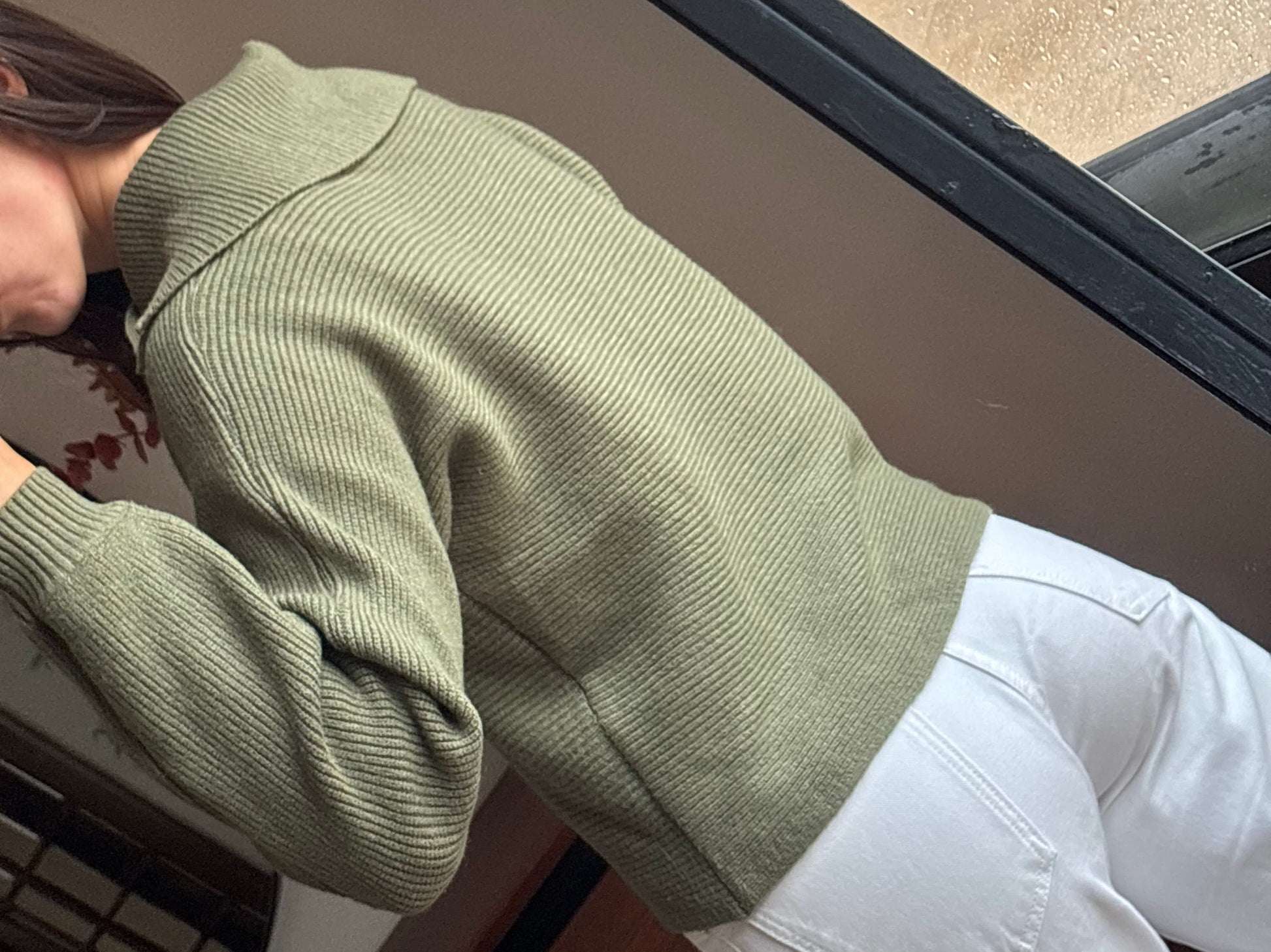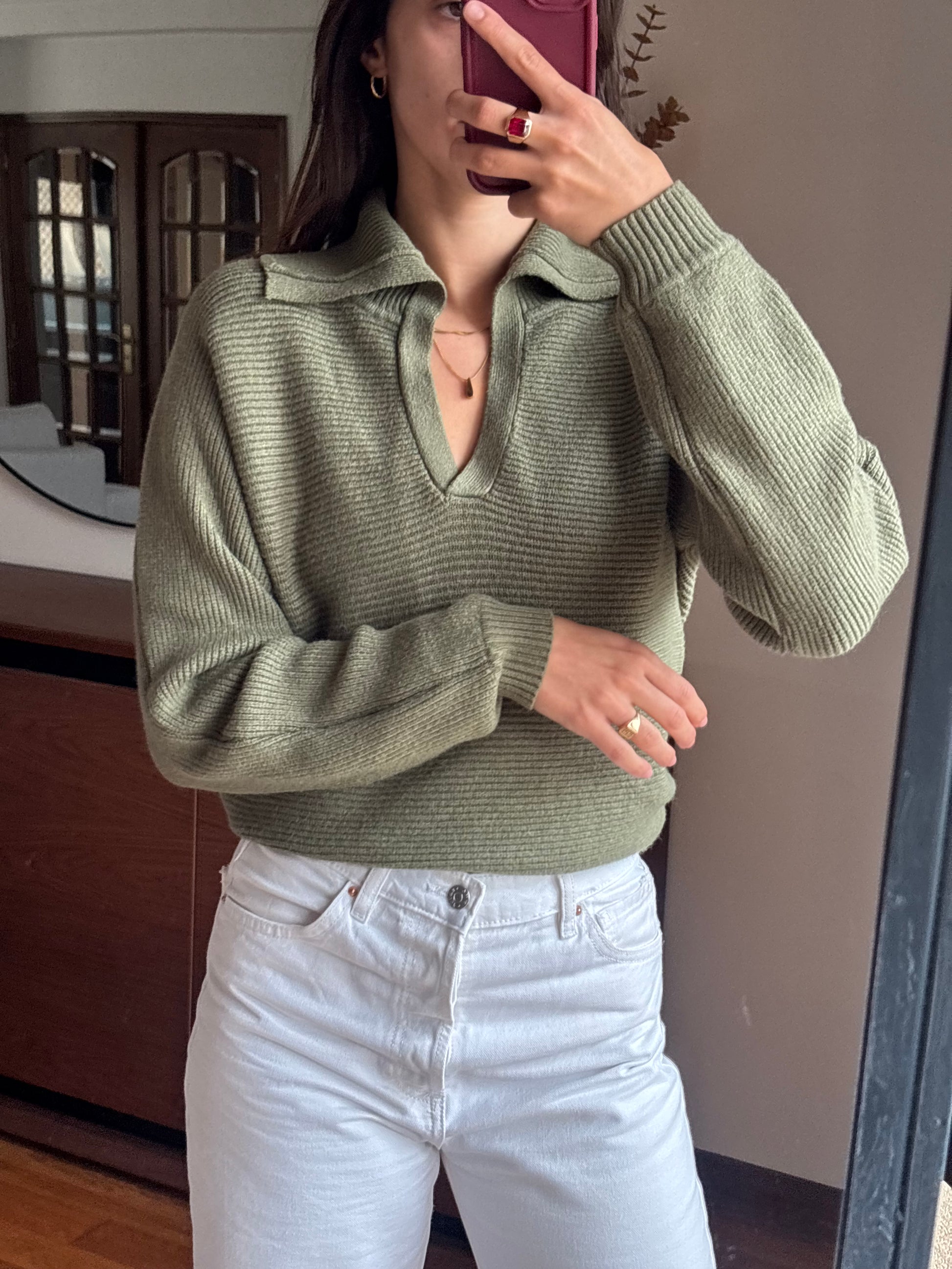 Malha de malha canelada num tom verde seco lindíssimo, super atual e fácil de conjugar. Tem um corte descontraído mas elegante, com gola aberta tipo polo que dá um ar muito giro e diferente à peça. É mesmo daquelas malhas confortáveis, macias ao toque e muito agradáveis de usar, perfeitas tanto para o dia a dia como para um look mais arranjado sem esforço. Produzida em Itália, nota-se a qualidade do material e do acabamento. Está em ótimo estado, sem defeitos.