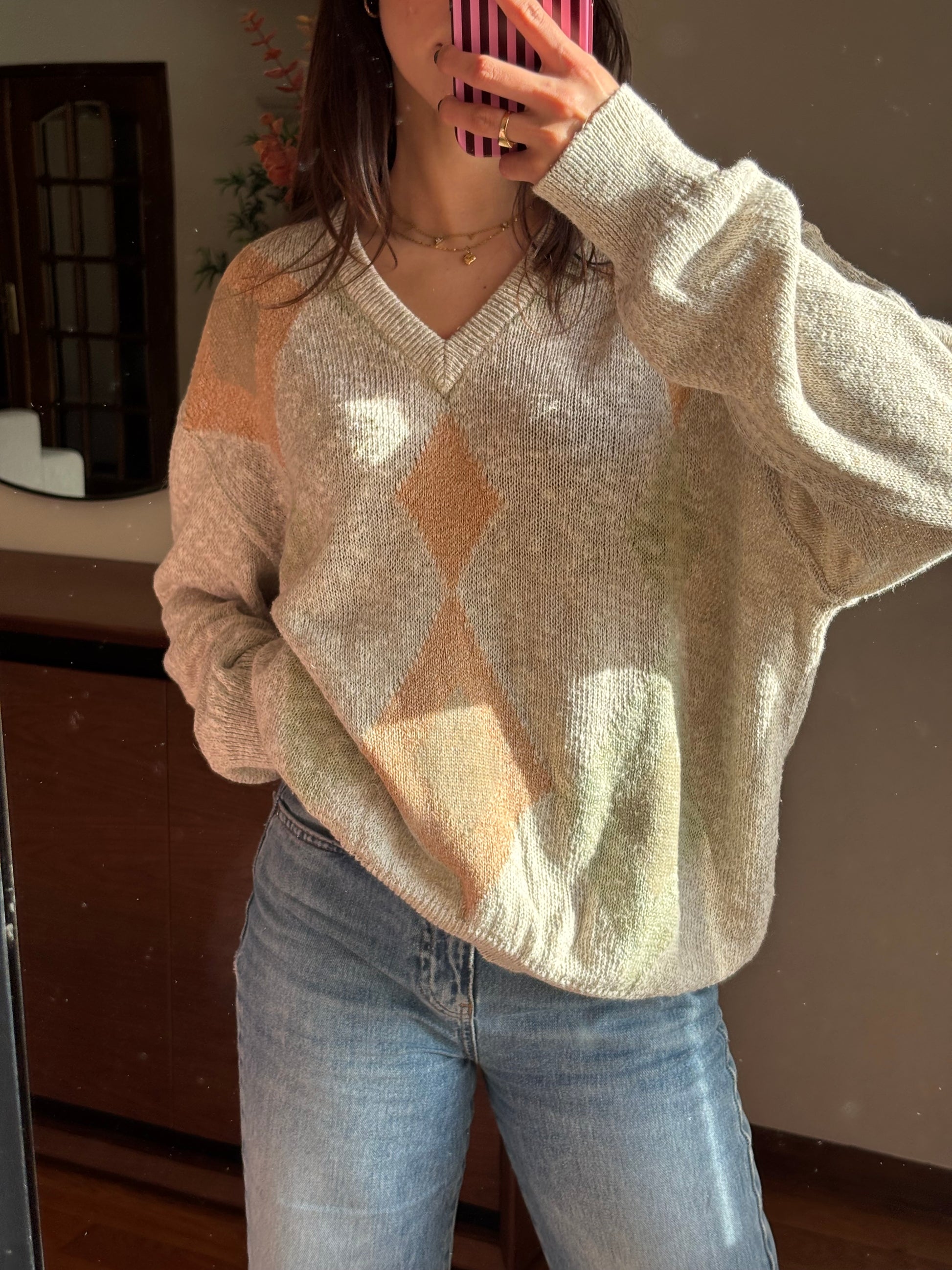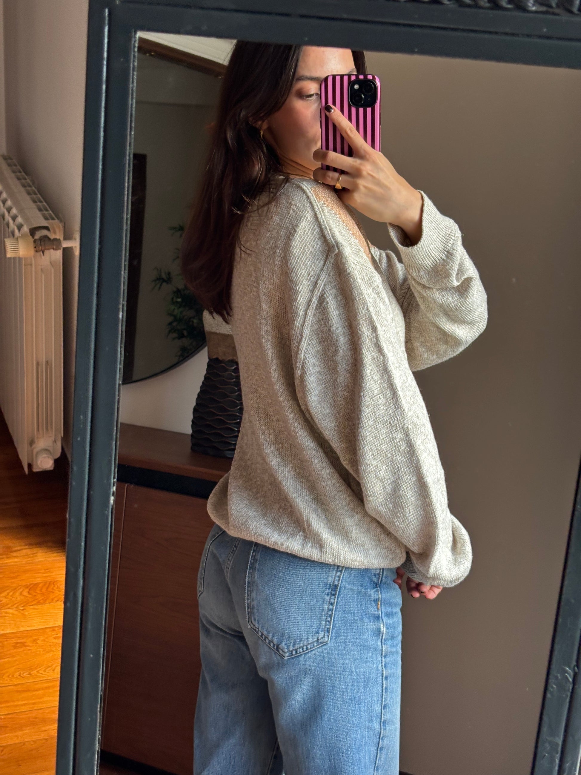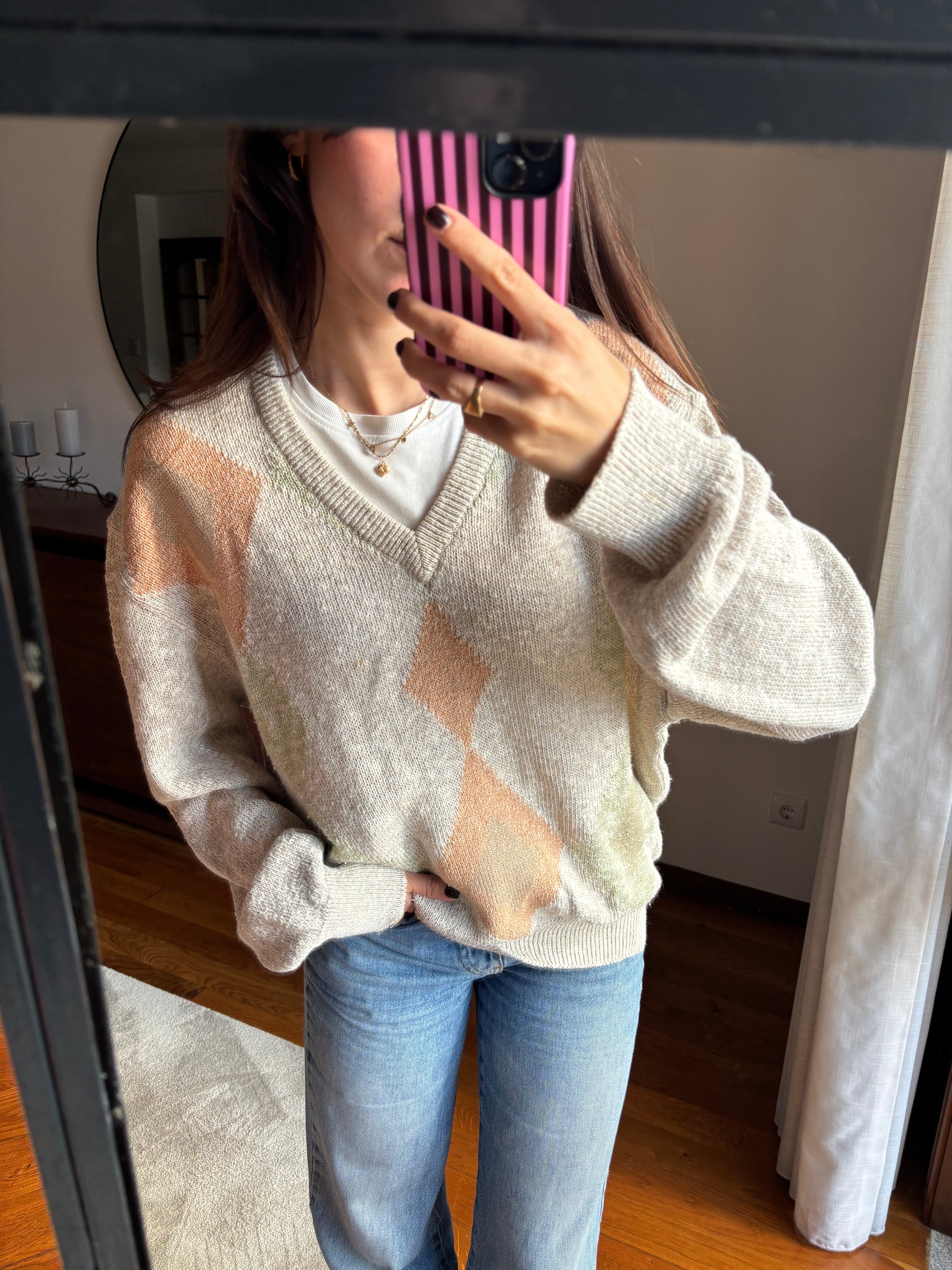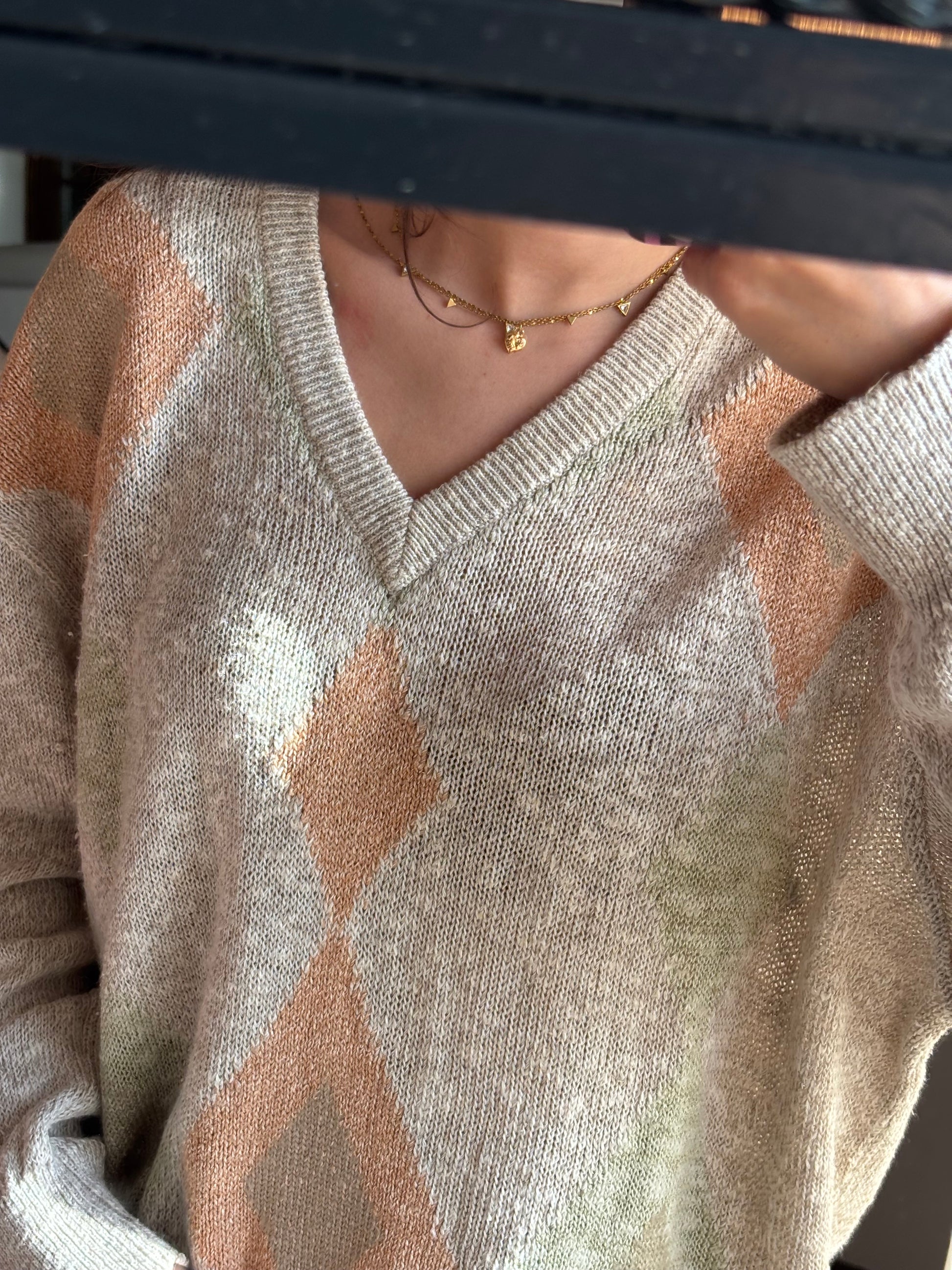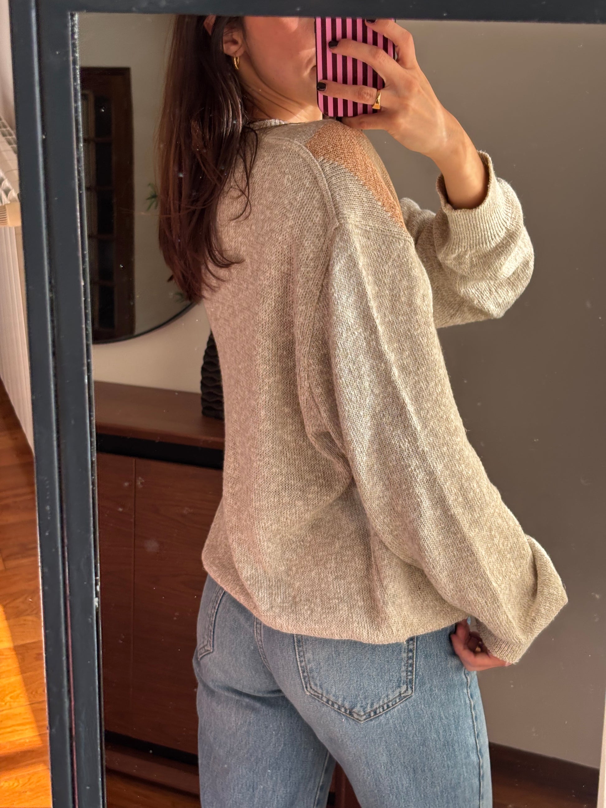 Camisola de malha leve com padrão em tons suaves e neutros, uma peça que se destaca pela qualidade dos materiais e pelo toque muito agradável. A mistura de linho, algodão e seda confere-lhe uma textura leve, respirável e naturalmente elegante, enquanto a acrílica ajuda a manter a forma e a durabilidade da malha. O decote em V alonga a silhueta, as mangas são largas e o fit é solto, criando um equilíbrio perfeito entre conforto e sofisticação. Uma camisola bonita, versátil e com um ar cuidado, pensada para durar e acompanhar vários looks ao longo do tempo.