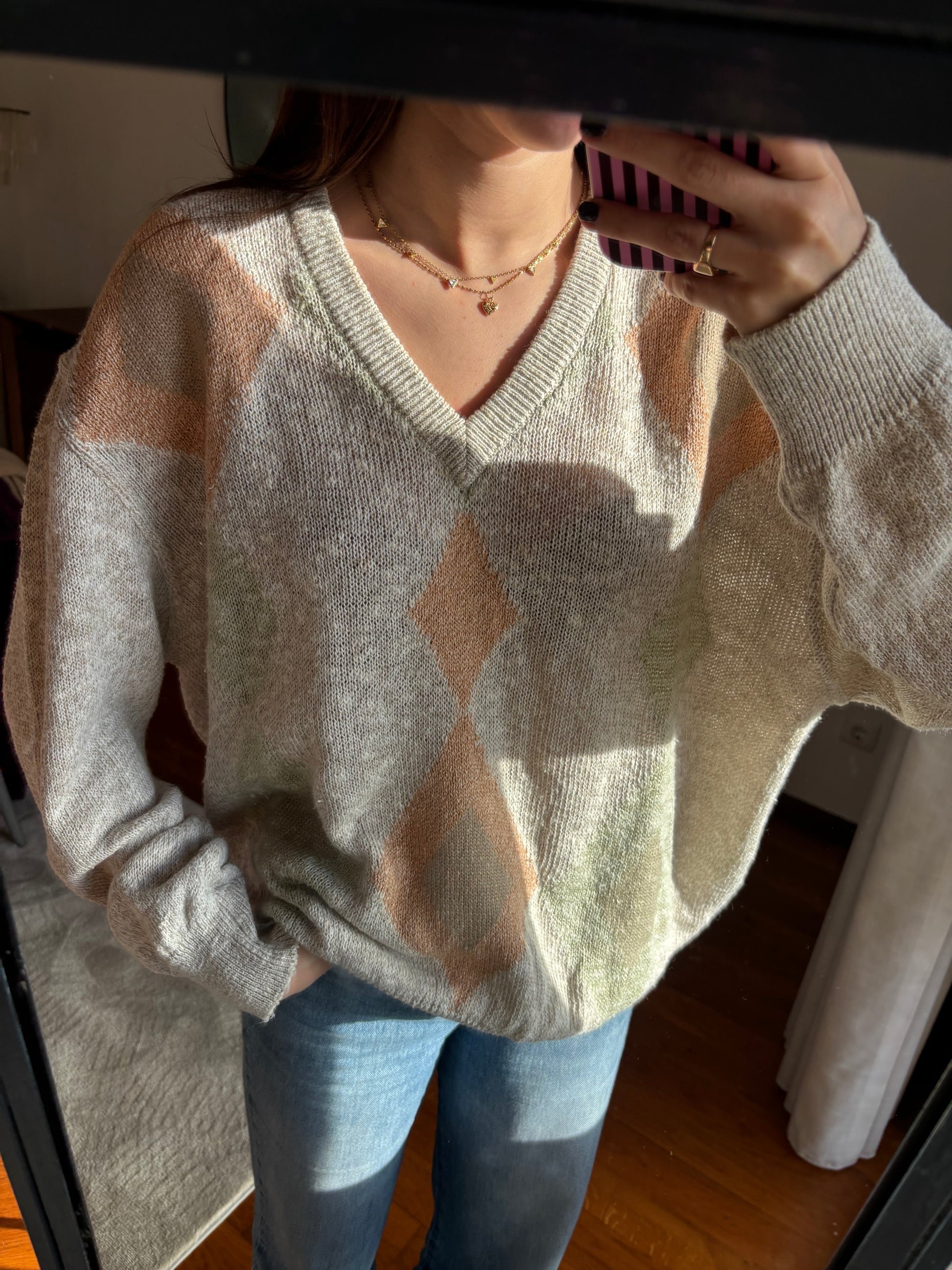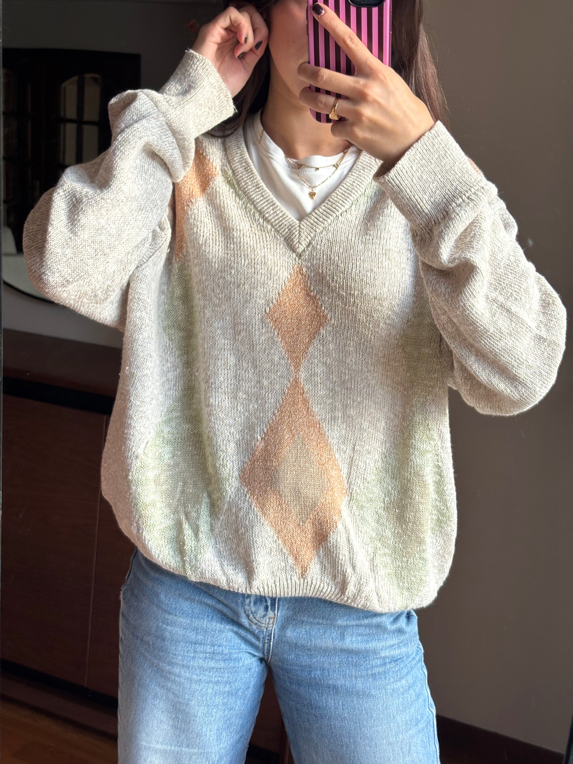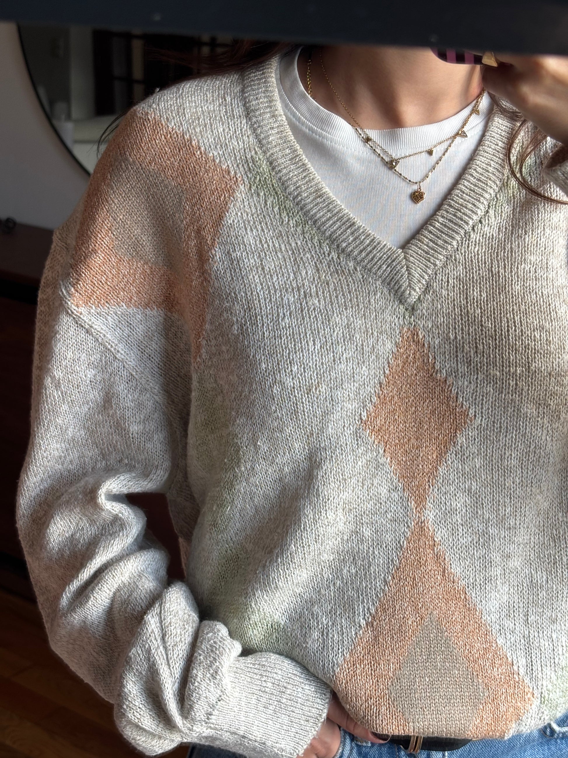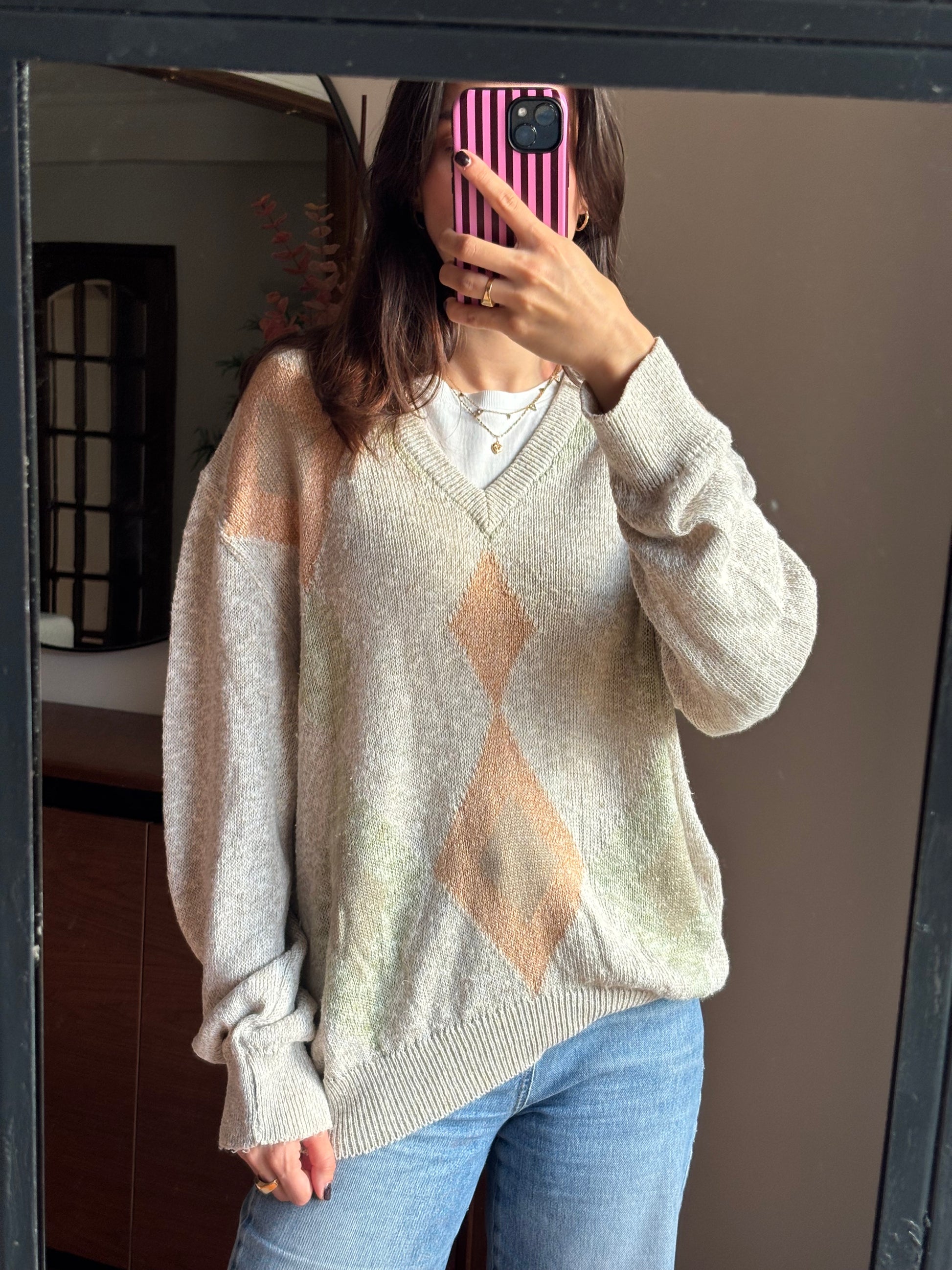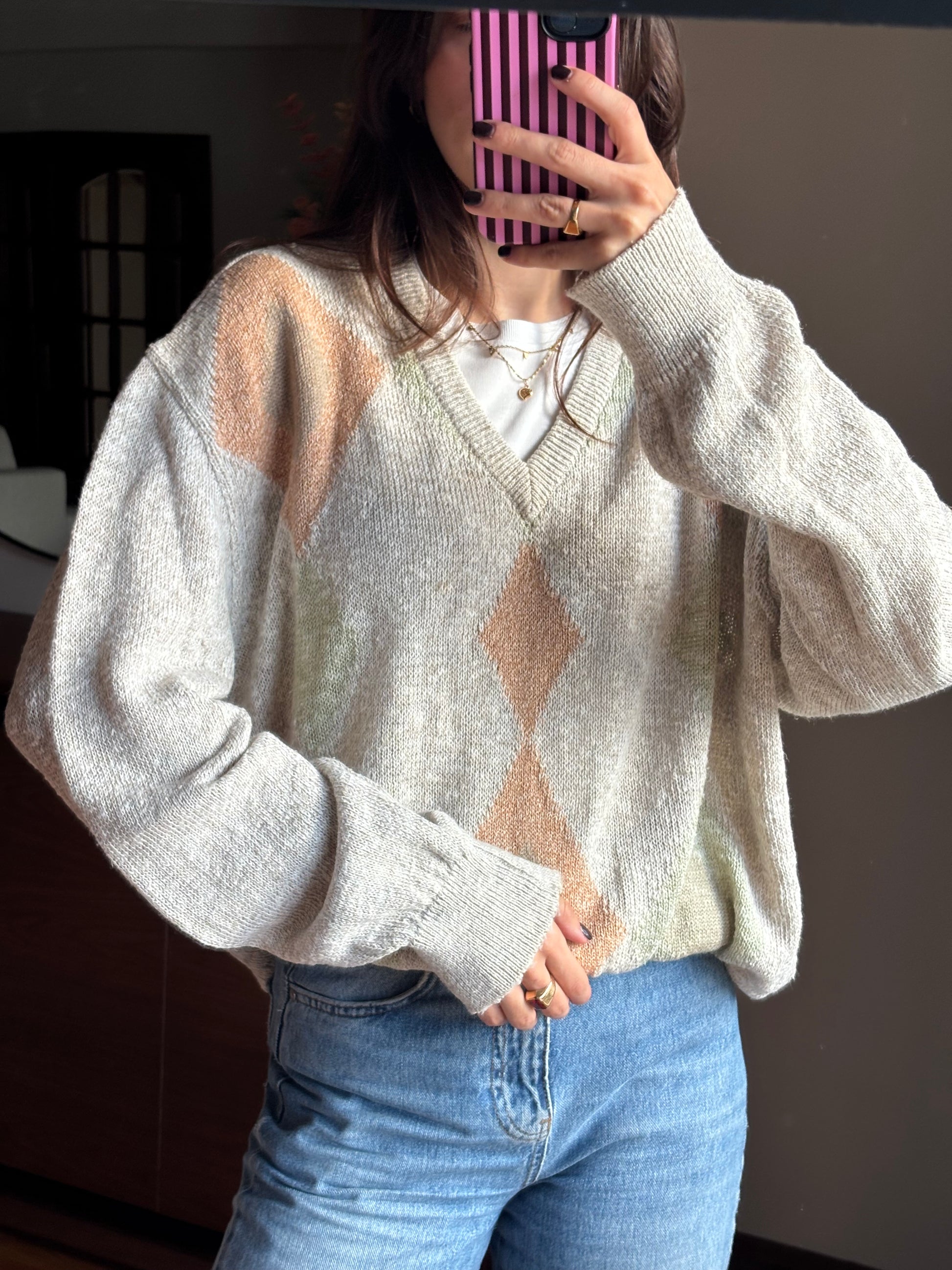 Camisola de malha leve com padrão em tons suaves e neutros, uma peça que se destaca pela qualidade dos materiais e pelo toque muito agradável. A mistura de linho, algodão e seda confere-lhe uma textura leve, respirável e naturalmente elegante, enquanto a acrílica ajuda a manter a forma e a durabilidade da malha. O decote em V alonga a silhueta, as mangas são largas e o fit é solto, criando um equilíbrio perfeito entre conforto e sofisticação. Uma camisola bonita, versátil e com um ar cuidado, pensada para durar e acompanhar vários looks ao longo do tempo.