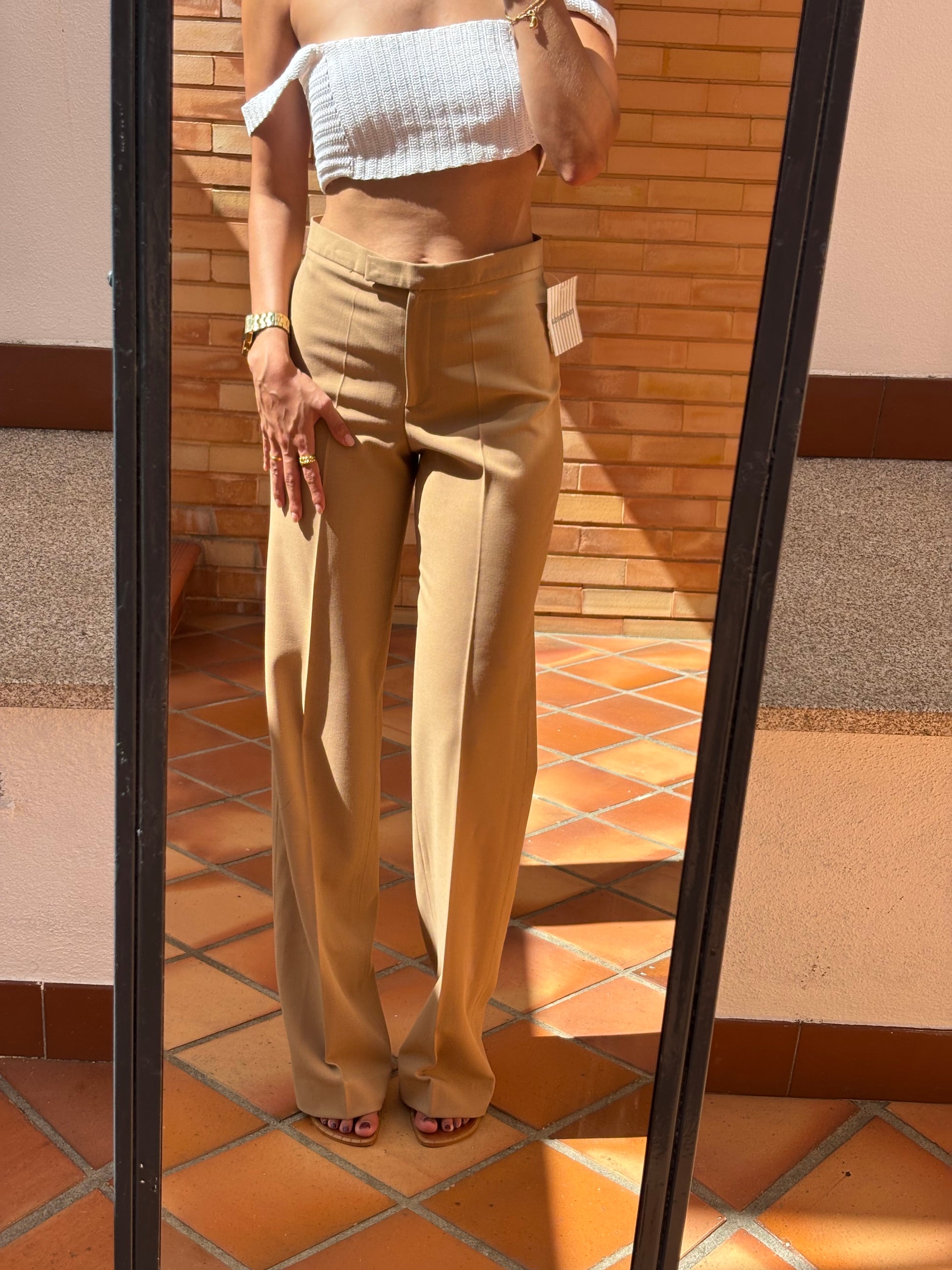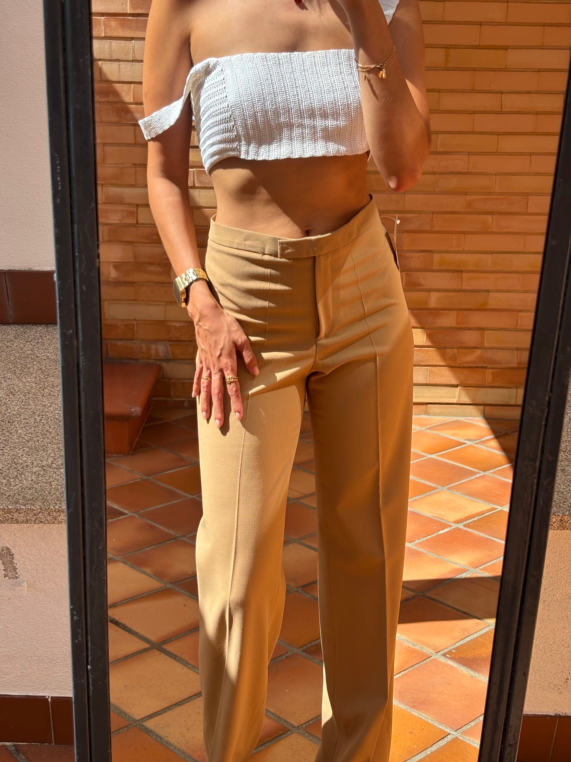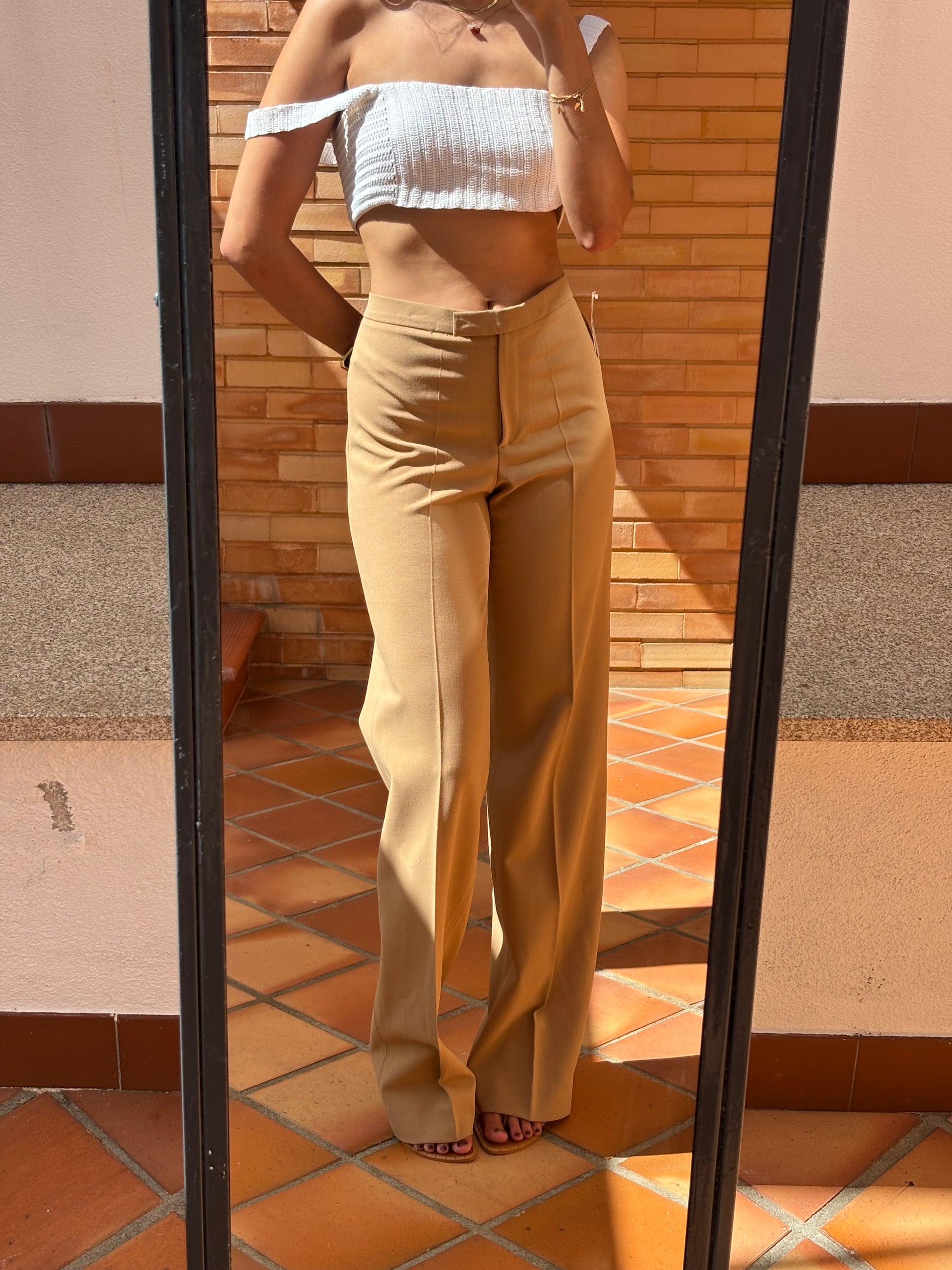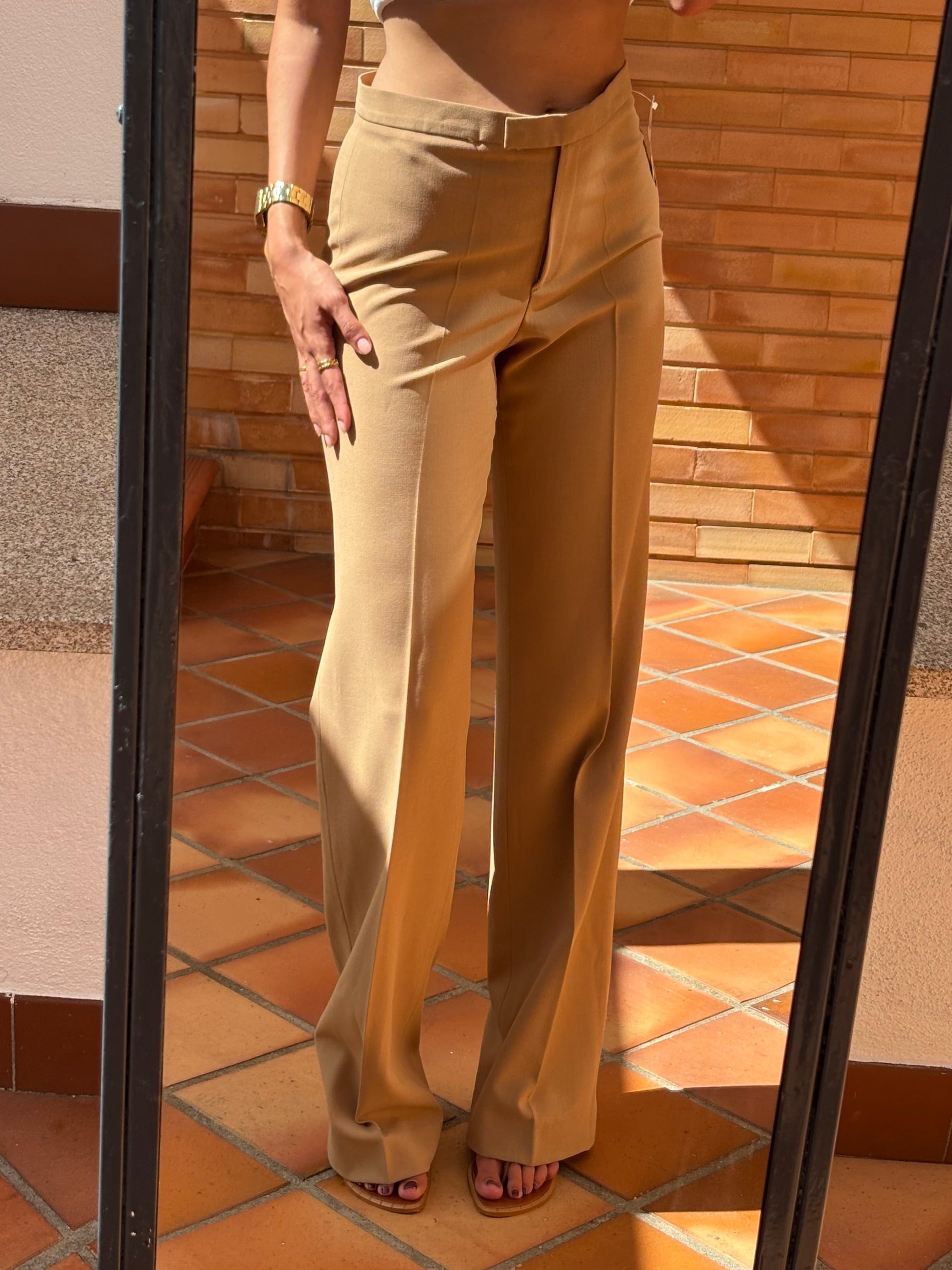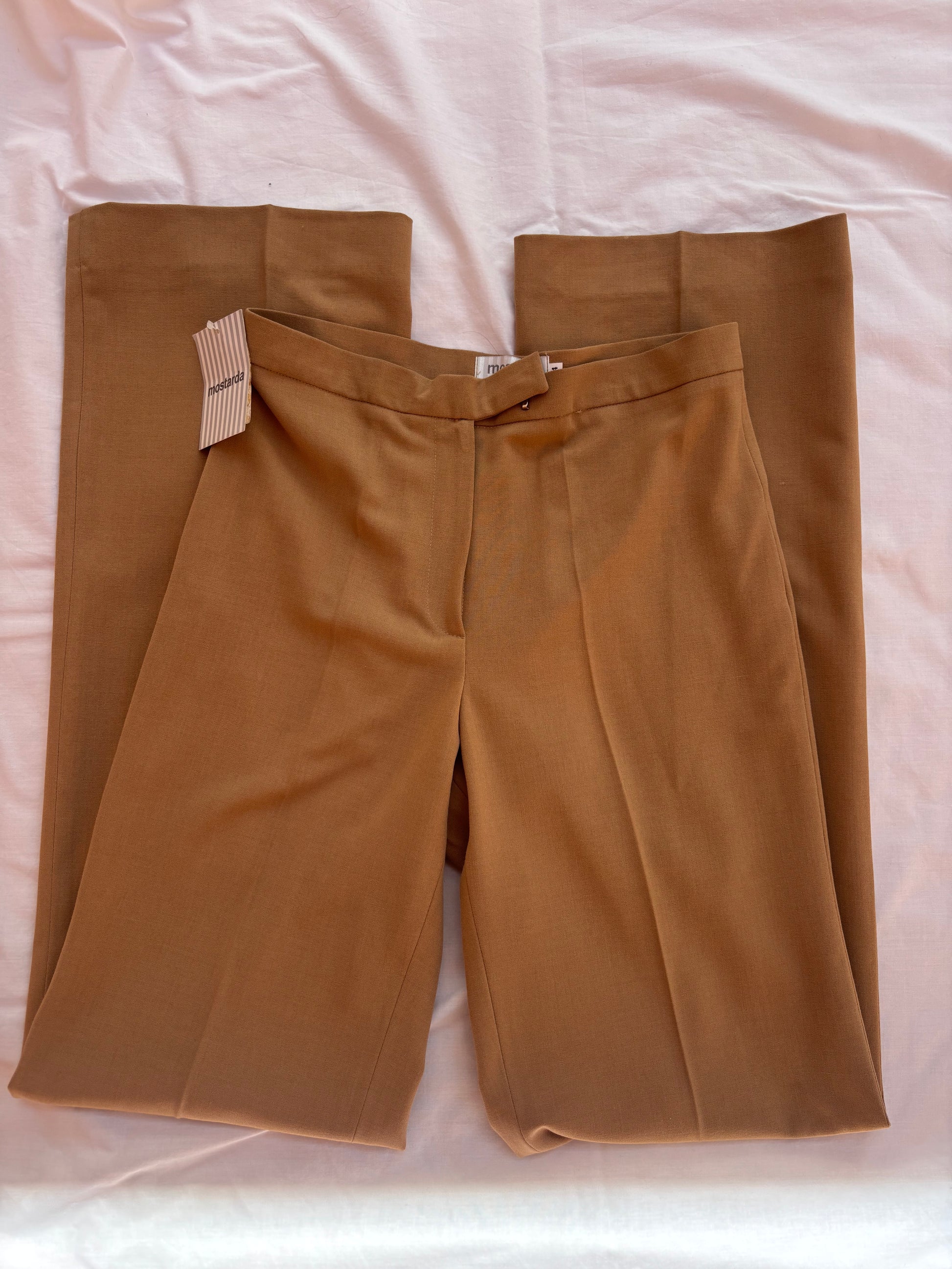 Calças vintage da marca Analogia (Porto), novas com etiqueta, de cor canel, corte reto e elegante, com fecho e gancho frontal. Ficam lindas no corpo, perfeitas para qualquer ocasião. Novas, com etiqueta.